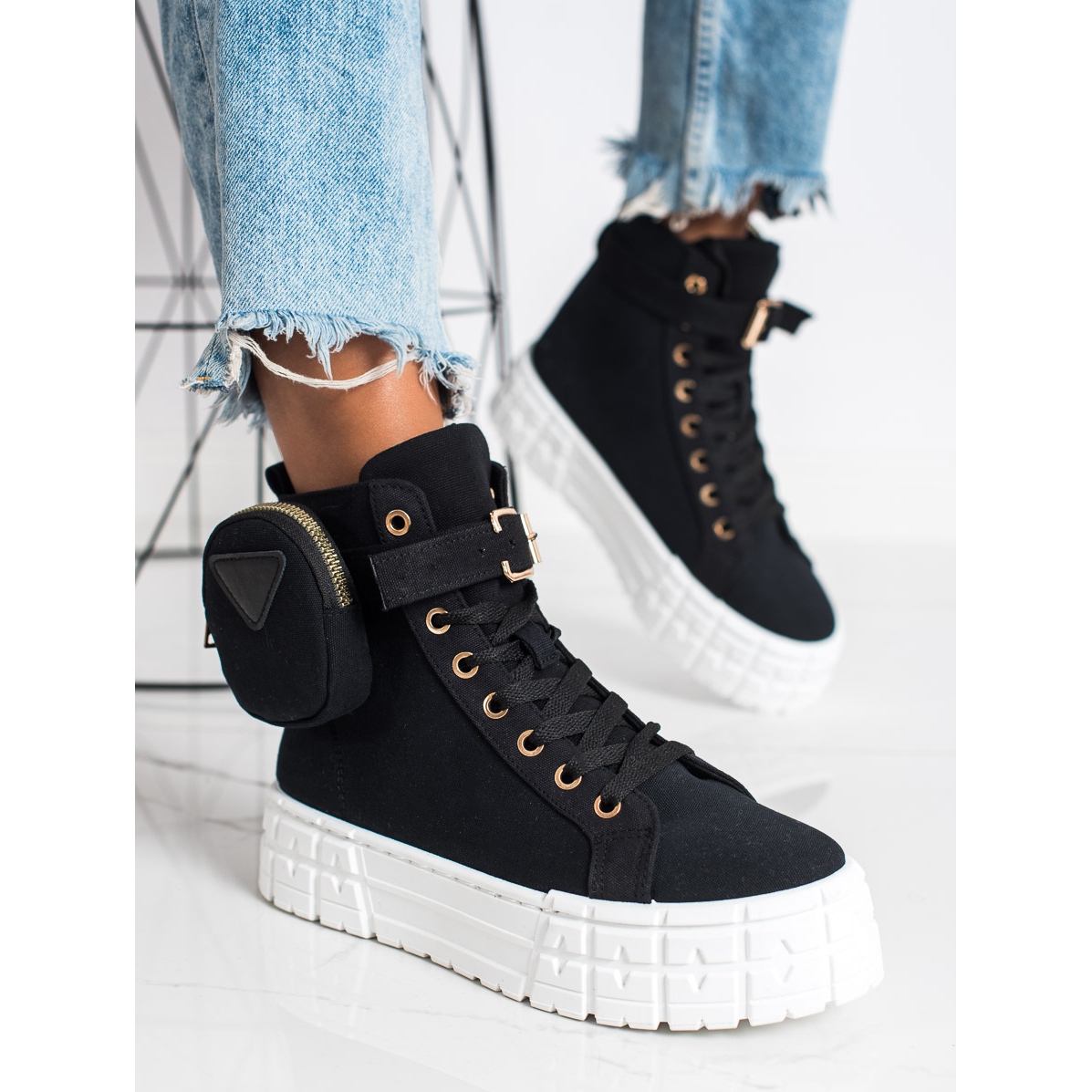 La couleur noire des chaussures les rend extrêmement universelles : elles s'adaptent parfaitement aux styles décontractés et plus élégants. De plus, les baskets ont été enrichies d'une poche innovante qui non seulement leur ajoute de l'originalité, mais permet également de ranger de petits objets.