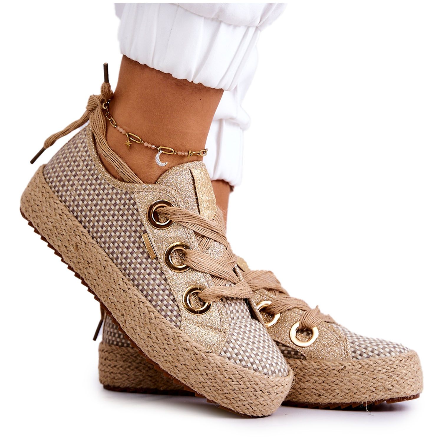 Détails: Baskets Tressées Femme Big Star JJ274392 Beige et Or