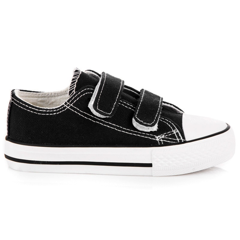 Baskets fermeture scratch pratiques et universelles dans une couleur noire classique - parfaites pour toutes les filles et tous les garçons actifs. Fabriquées en tissu textile résistant, avec un bout blanc contrastant et une semelle en caoutchouc blanc avec bande de roulement. Le profil sportif et plat de la semelle assure le confort pendant le jeu et les activités quotidiennes.