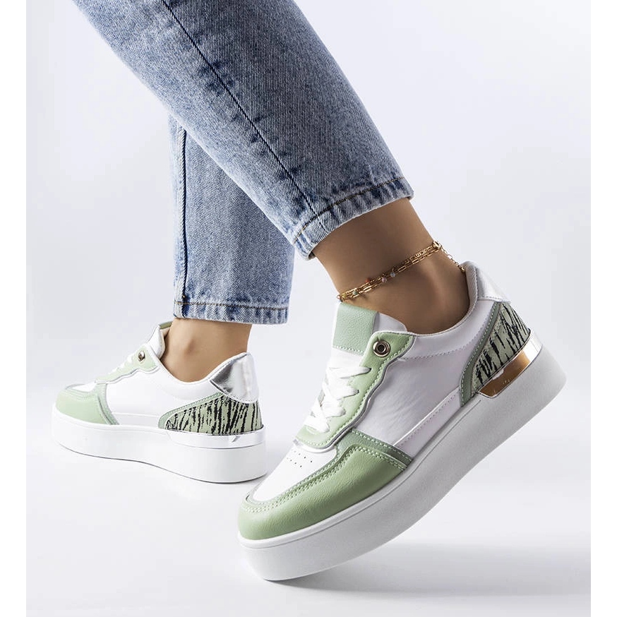 Le produit décrit est une sneaker à plateforme pour femmes de Tooele. Les chaussures sont vertes, appelées "Green" par le fabricant, avec une couleur blanche supplémentaire sur la semelle. La semelle est en caoutchouc, ce qui procure une traction. La chaussure elle-même est en cuir écologique, ce qui signifie qu'elle est végétalienne. Le modèle de la chaussure, AD-709, est bas et a un bout rond, donnant à l'utilisateur une liberté de mouvement.