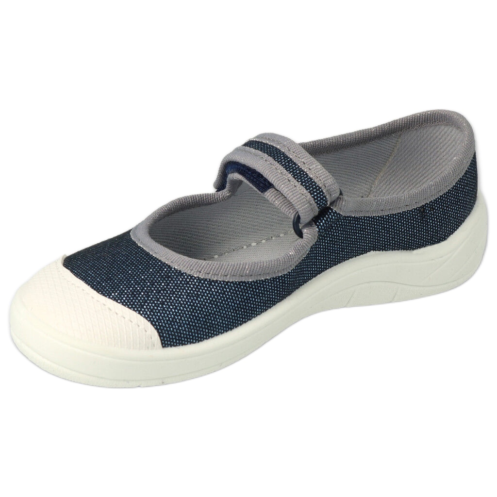 Une proposition légère et confortable de Befado - 208Y048 Pantres dans une couleur bleue universelle. Conçu pour une utilisation quotidienne à la maison et à la maternelle: facile à mettre grâce au fermeture scratch et en toute sécurité pour le développement des pieds.