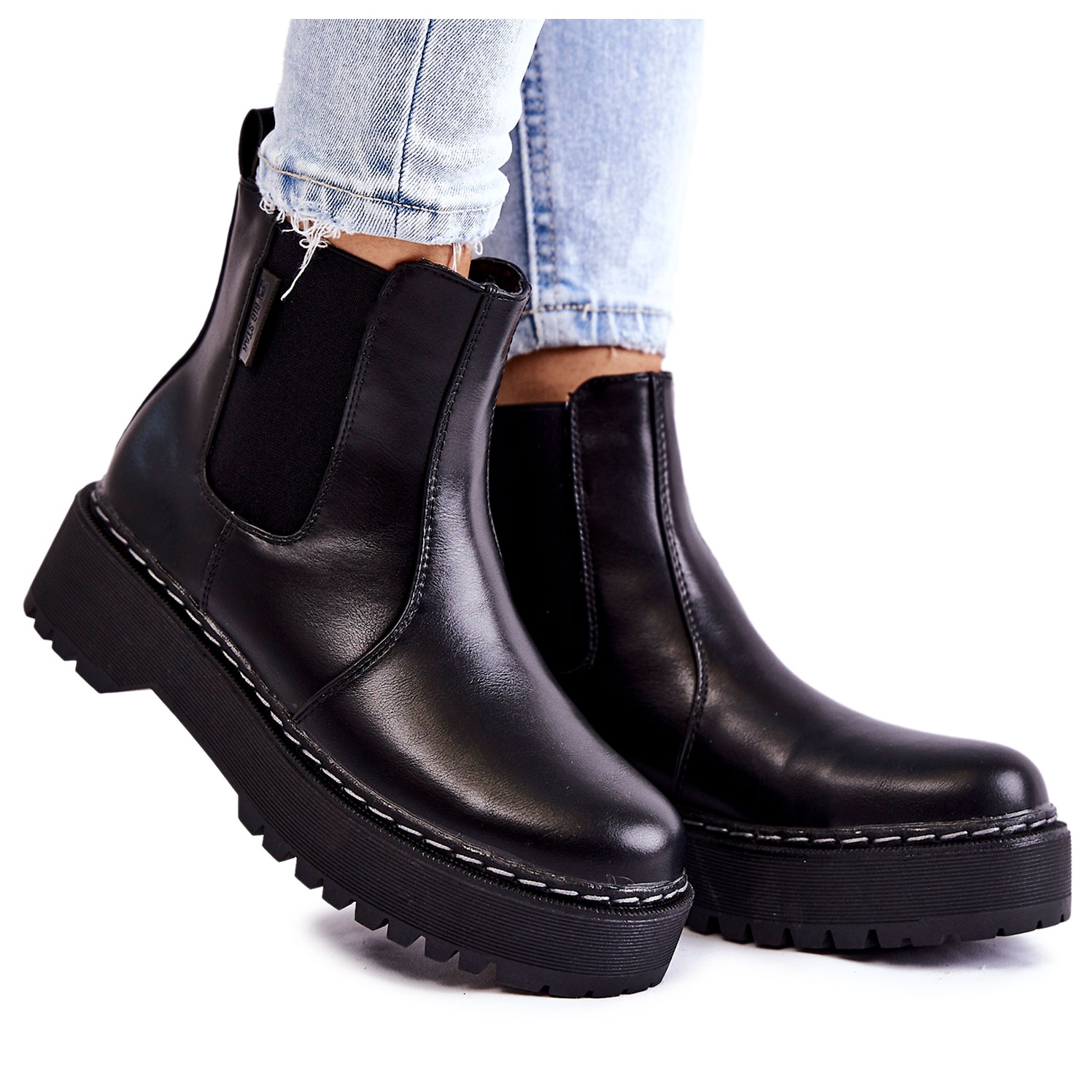 Bottes Big Star II274101 pour femmes - Trappers noirs qui chauffent le style et le pied en hiver. La coupe moderne et féminine combine le style urbain avec des solutions pratiques: la cheville supérieure de 14,5 cm de haut, un nez rond et une plate-forme stable avec une hauteur de 4,5 cm, ajoutez une certitude et mince subtilement la figure.