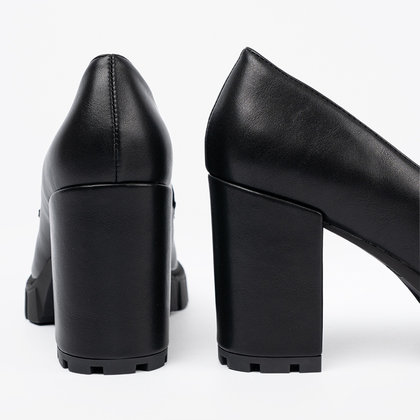 Les chaussures ont un fermoir coulissant et une fixation construite, qui garantit la facilité de mise en place et un ajustement parfait au pied. Un nez rond et un insert textile garantissent le confort toute la journée, et la semelle du trappeur offre une adhérence adéquate, ce qui les rend idéales pour diverses occasions. La hauteur du talon de 9 cm donne la silhouette élancée et vous permet en même temps de vous déplacer librement.