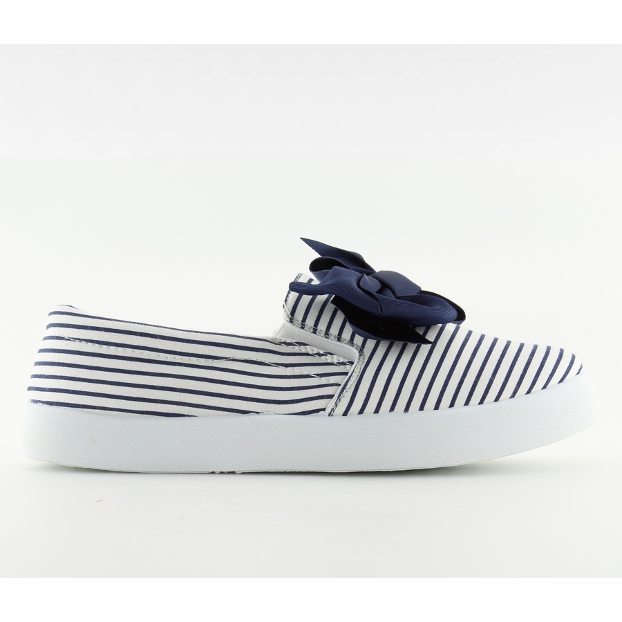 Slipons marins B860 blanc/bleu marine - baskets d'été légères de style marin, parfaites pour les promenades de vacances et le quotidien. Fabriqués entièrement en tissu, ils séduisent par une combinaison classique de blanc et de bleu marine et un nœud décoratif qui ajoute un caractère féminin. La semelle blanche et sportive (plateforme/hauteur du talon 2,0 cm) souligne le style décontracté et assure un confort au quotidien.