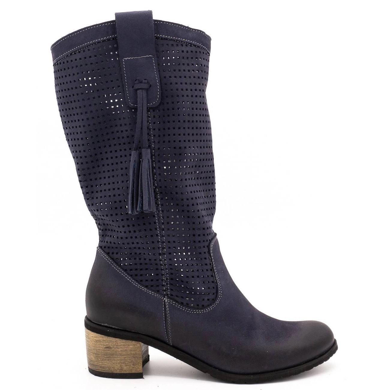 Boots féminins élégants et ouverts Olivier D44 dans une teinte bleu marine profonde. Un genou classique coupé avec des découpes délicates et des franges décoratives qui ajoutent du caractère. Parfait pour les femmes qui apprécient une apparence élégante et en même temps confortable tous les jours.