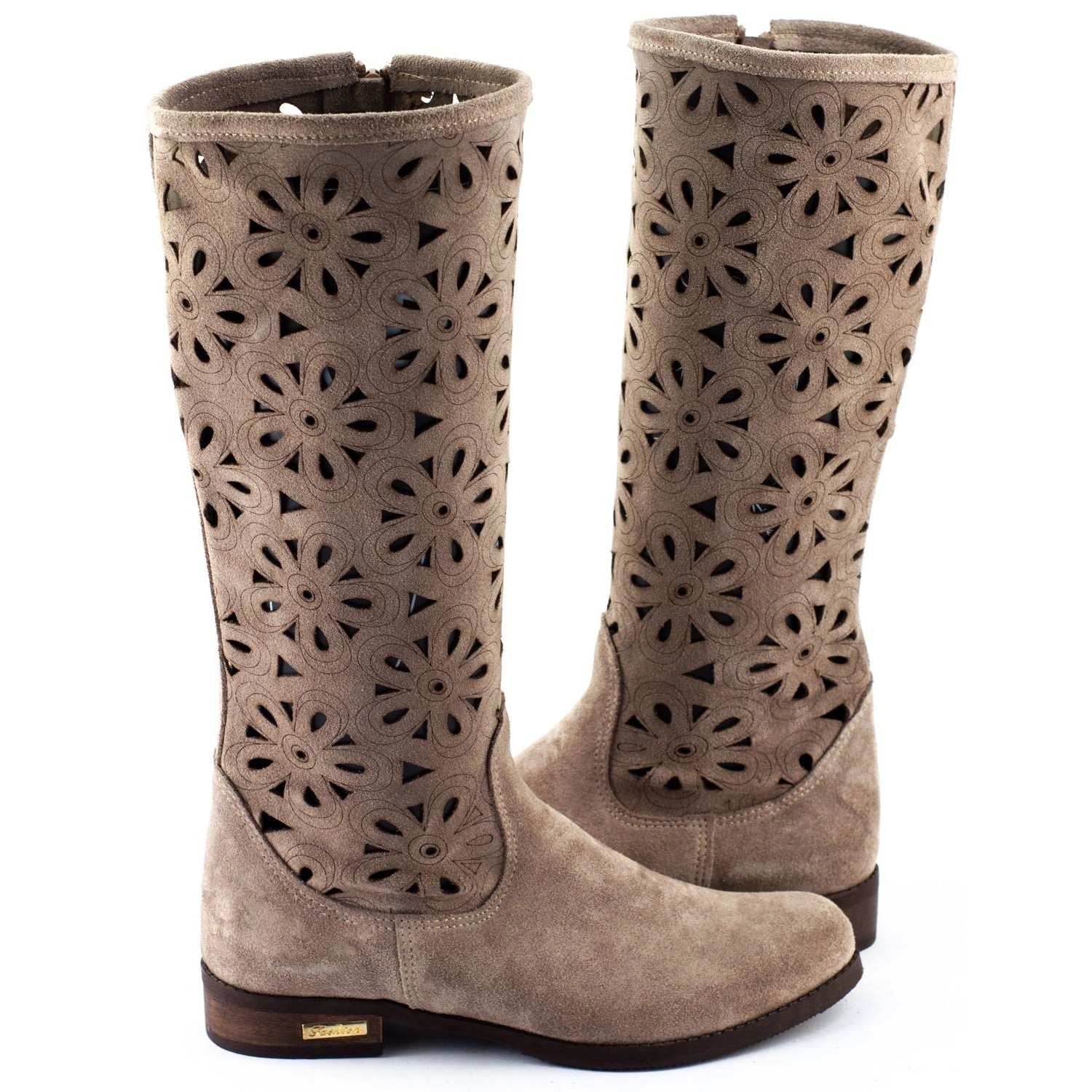 Il s'agit de bottes ajourées pour femme d'Olivier, modèle No, de couleur beige foncé. Les bottes sont en cuir naturel (nubuck), ce qui garantit leur douceur et leur ajustement facile à la forme des jambes. La partie supérieure de la chaussure est décorée d'un motif géométrique ajouré, tandis que la partie inférieure présente une semelle solide et synthétique avec un talon bas de 3 cm de haut qui isole bien le pied du sol.