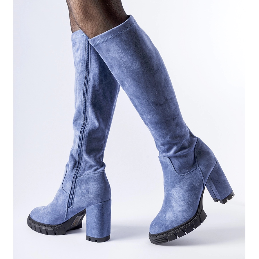 Les bottes bleues à talon massif sont des chaussures pour femmes élégantes et pratiques, parfaites pour les journées les plus froides. Ce sont des chaussures à hauteur de genou, fabriquées en cuir suédé écologique de haute qualité dans une nuance de bleu à la mode (le nom de couleur du fabricant est Bleu), ce qui en fait un choix à la fois élégant et éthique.
