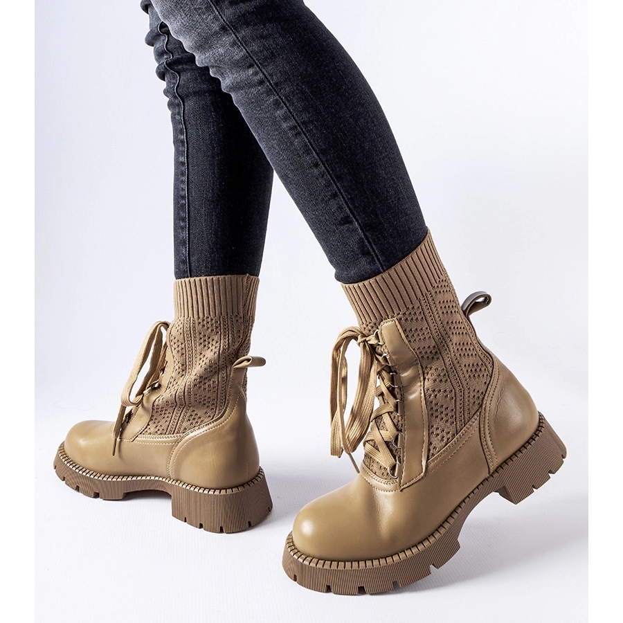 Des bottes de portique féminines élégantes et légères dans une teinte beige (nom du fabricant: Khaki). La tige ouverte leur donne la légèreté et les rend parfaites pour les saisons temporaires (village d'automne). Un modèle pour la cheville avec un nez rond universel et une fixation lacé - une combinaison de confort et un style subtil.