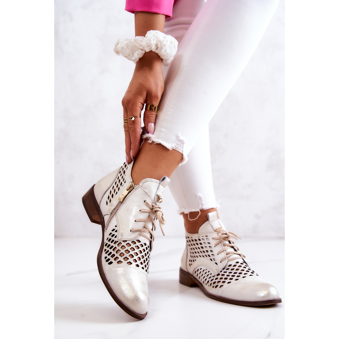 Détails: Boots Cuir Ajouré Nicole 2704/004 Blanc et Doré