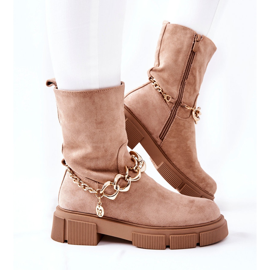 La semelle épaisse et stable assure un confort de port et une excellente adhérence sur diverses surfaces. Une jolie chaîne décorative leur donne du caractère et en fait un élément unique de votre garde-robe. Les bottes sont fermées par une fermeture éclair pratique, ce qui les rend faciles à enfiler et à enlever.