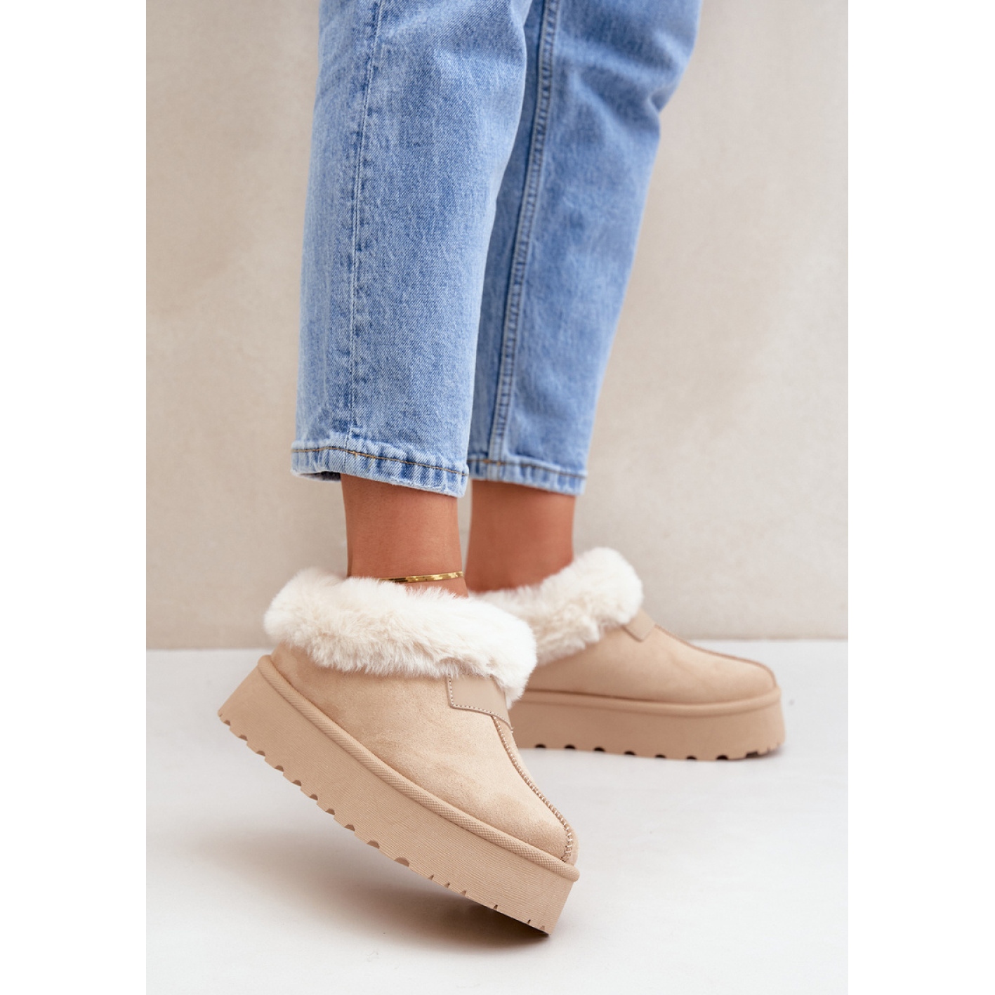 Les bottes de neige sont caractérisées par une tige basse avec une hauteur de 6 cm, ce qui est fini avec une fourrure douce, garantissant non seulement la chaleur, mais aussi un look agréable. Grâce à la plate-forme de 4,5 cm de haut, ces chaussures allongent non seulement optiquement les jambes, mais garantissent également le confort lors de longues promenades les jours froids.