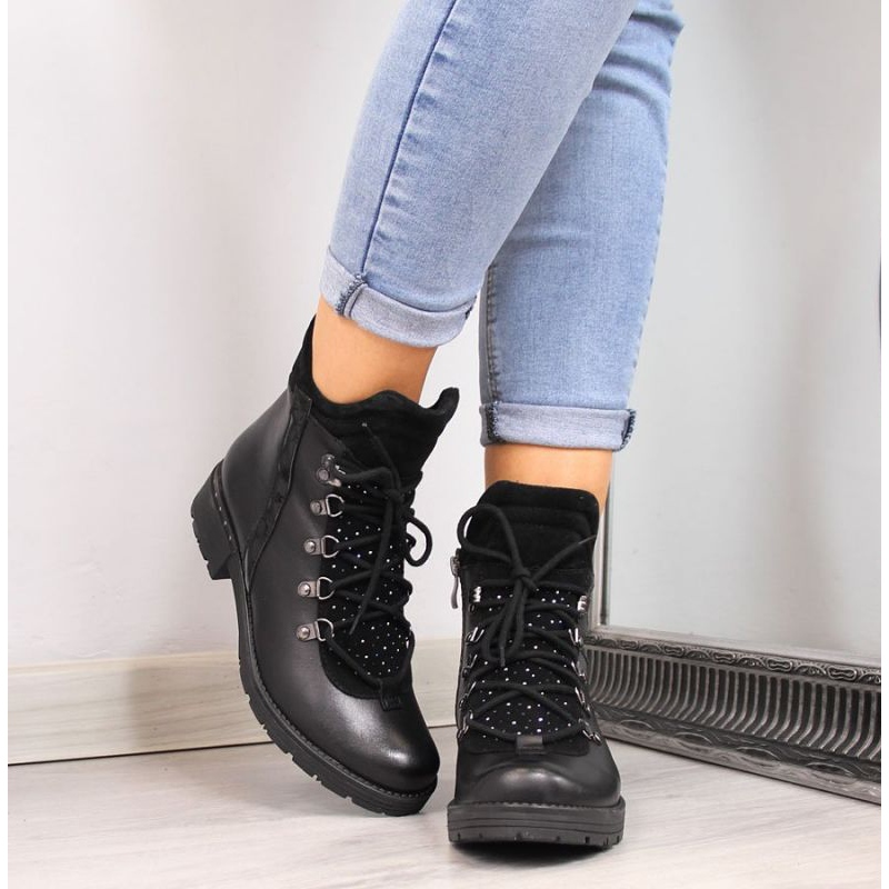 Les bottines en cuir Dolce Pietro W P56 avec strass sont le choix parfait pour les femmes à la recherche de chaussures à la mode et fonctionnelles pour l'automne et l'hiver. Le modèle haut protège parfaitement les chevilles, et la connexion simultanée de la fermeture éclair et des lacets rend les chaussures confortables et faciles à enfiler.