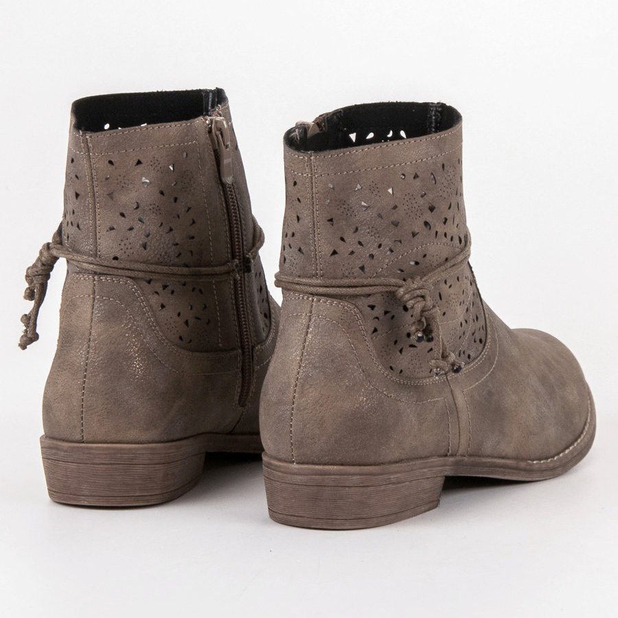 Un élément caractéristique de ces bottes est la tige ajourée, qui ajoute légèreté et originalité. Un cordon autour de la cheville vous permet d'ajuster les chaussures à vos besoins individuels, tandis que la fermeture éclair sur le côté gauche facilite l'enfilage et le retrait. Les bottes sont équipées d'un talon bas et plat de 3 cm de haut, ce qui les rend très confortables à porter, parfaites pour un usage quotidien.
