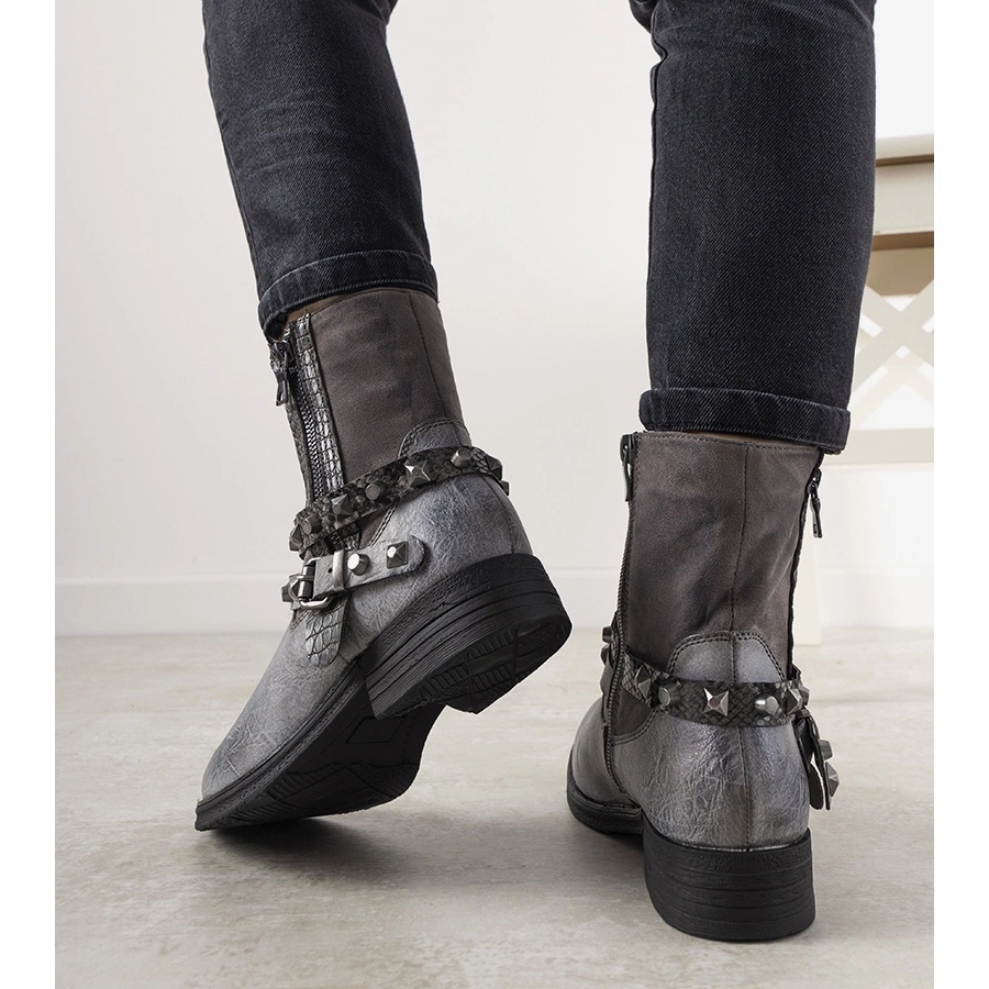 Découvrez un style unique de bottines grises qui allient parfaitement mode et confort ! Fabriquées en cuir écologique de haute qualité et en éco-daim, ces bottes attirent l'attention grâce à des brides originales ornées de clous. La couleur grise classique les rend parfaitement adaptés à n'importe quel style, à la fois décontracté et élégant.