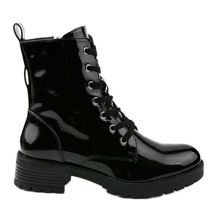 Les bottes sont conçues avec un lien classique et une fermeture éclair supplémentaire, ce qui facilite l'enfilage et le retrait. La plateforme de 3 cm de hauteur est surmontée d'une semelle crantée, qui garantit stabilité et confort à chaque pas. Le bout rond ajoute un charme féminin et la finition vernie fait de ces bottes un choix idéal pour les occasions décontractées et plus élégantes.