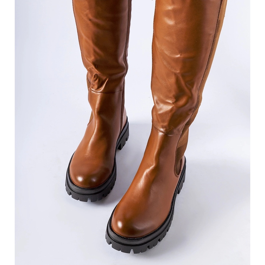 Des bottes massives brunes décorées avec une ceinture Stuart - des bottes féminines élégantes et confortables qui sont super pour la saison d'automne. Conçus pour une jeune génération qui apprécie l'apparence et le confort à la mode, ils combinent une coupe intemporelle avec des solutions pratiques.