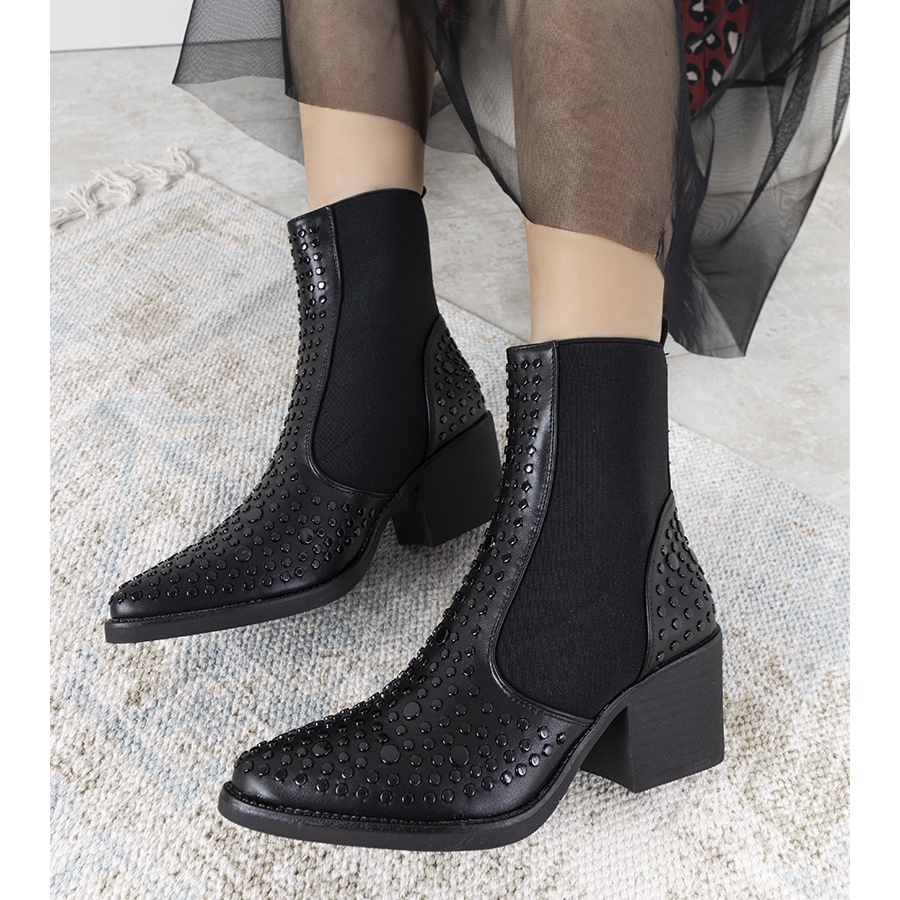 Grâce aux strass noirs décoratifs, les bottines Camus se distinguent des autres modèles, attirant l'attention et ajoutant une touche de fantaisie à l'ensemble du style. Le bout pointu et la tige ajustée affinent optiquement les jambes, ce qui en fait un choix parfait pour diverses occasions – des réunions informelles aux sorties élégantes.