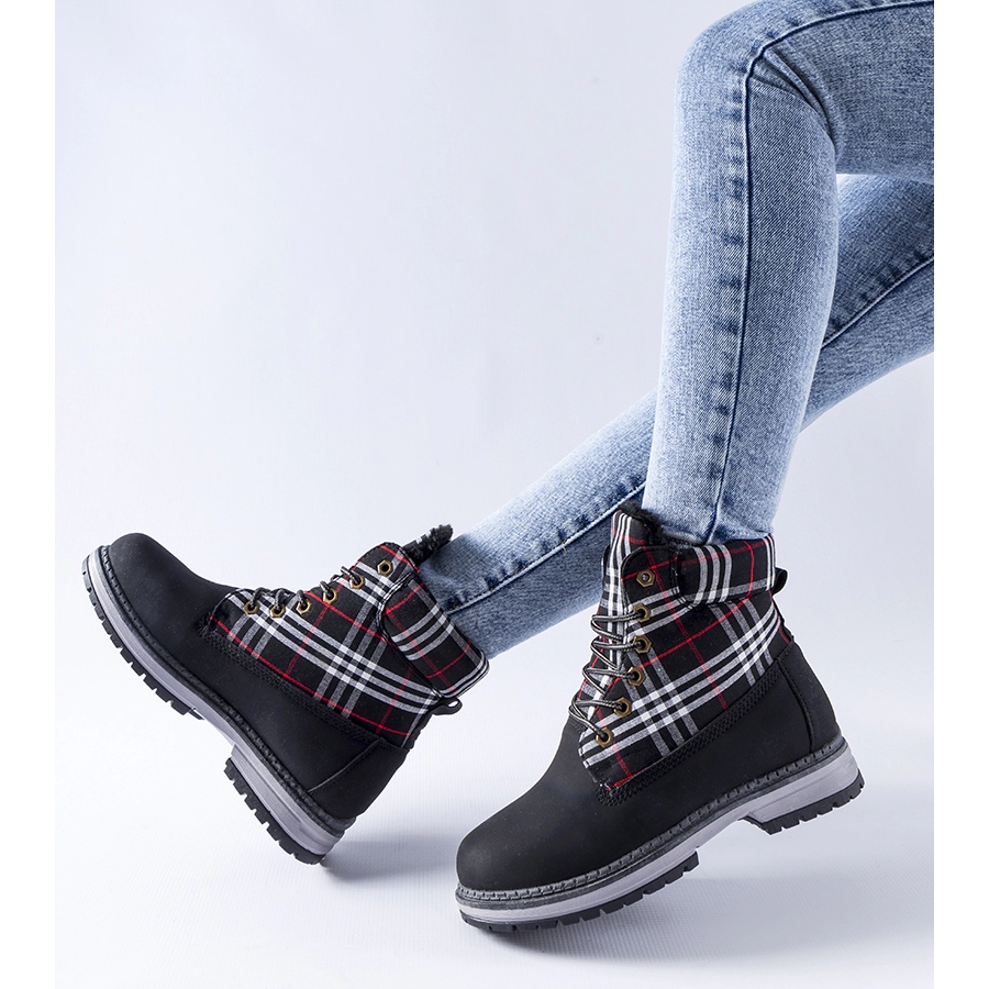 À la mode et fonctionnelles - c'est ainsi que l'on peut décrire en quelques mots des bottes noires ornées d'un motif à carreaux. Ces chaussures originales pour femmes allient durabilité, style et confort, ce qui sera certainement apprécié par toutes les femmes à la recherche de chaussures polyvalentes pour les journées les plus froides.