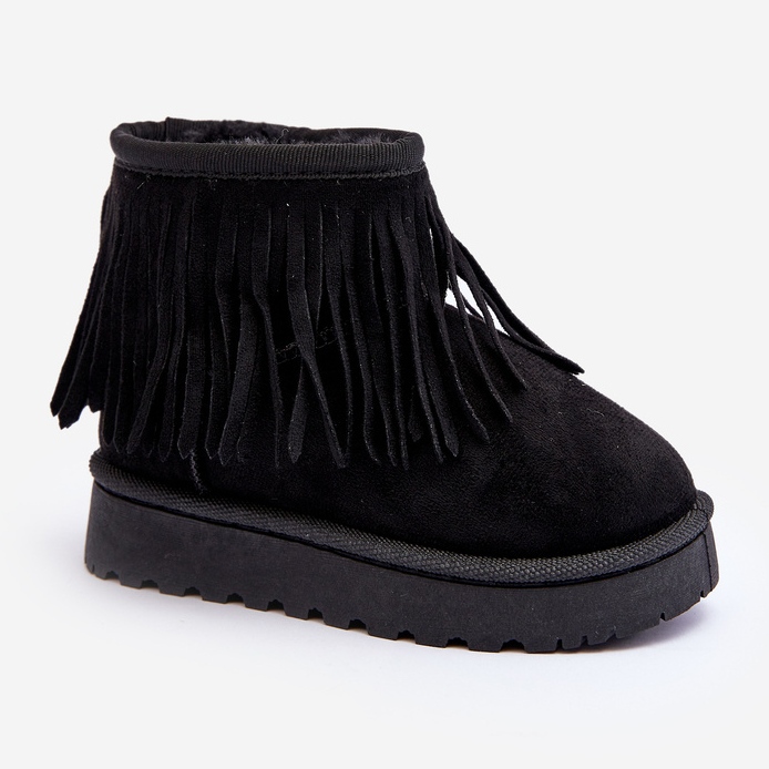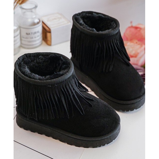 Le produit est une paire de bottes/bottes de neige noires pour enfants, parfaites pour les journées froides. Les chaussures sont faites de cuir éco-daim avec un fond en caoutchouc durable, isolé avec une fourrure épaisse pour plus de chaleur. Les chaussures sont ornées de franges sur la tige arrivant jusqu'à la cheville. Les bottes sont à enfiler et disponibles dans de nombreuses tailles, indiquées dans un tableau spécial. Les chaussures disposent également d'une plateforme. Bien que destinées spécifiquement aux filles, les bottines sont disponibles dans des nuances noires polyvalentes et peuvent s'associer à une variété de tenues. Le produit n'a pas de héros ou de thème spécifique, ce qui en fait un choix universel pour les enfants.