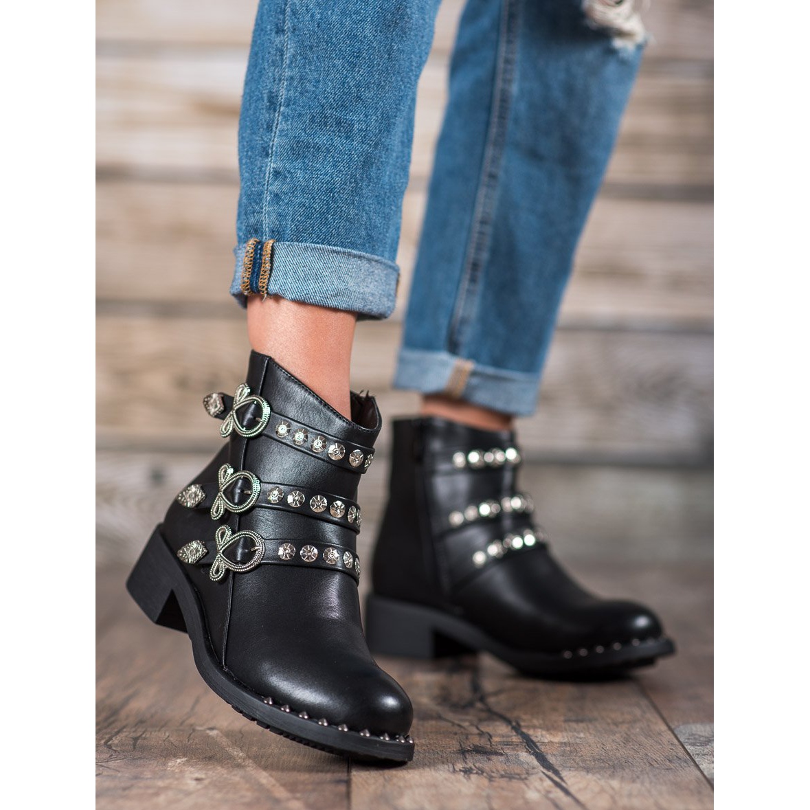 La tige des chaussures protège les pieds du froid et de la pluie, ce qui rend les bottes parfaites pour la saison automne/hiver. Leur élément intéressant sont les décorations métalliques sous forme de strass et de clous, qui leur confèrent un caractère unique et une expression féminine.