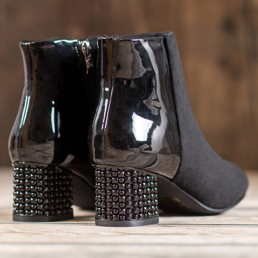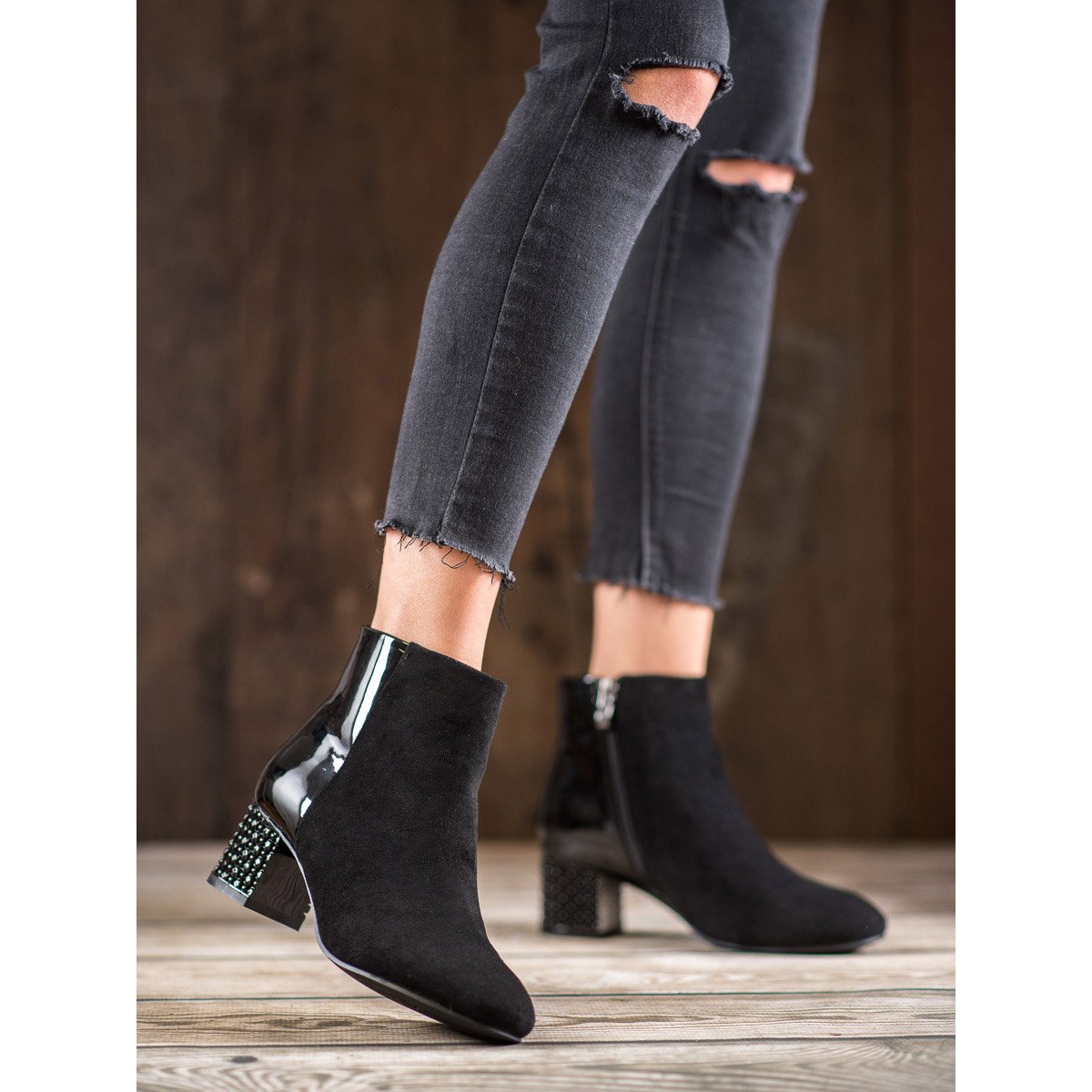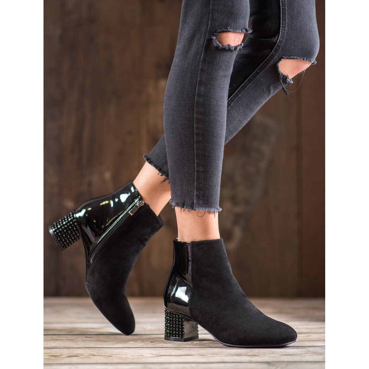 Découvrez des bottines à talons hauts uniques de SHELOVET - le choix parfait pour les femmes qui apprécient l'élégance et le confort. Ces bottes noires tendance ont une tige jusqu'aux chevilles en matériau semblable au cuir de haute qualité. L'avant de la chaussure se distingue par une finition en daim, tandis que l'arrière est laqué, ce qui leur confère un caractère unique.