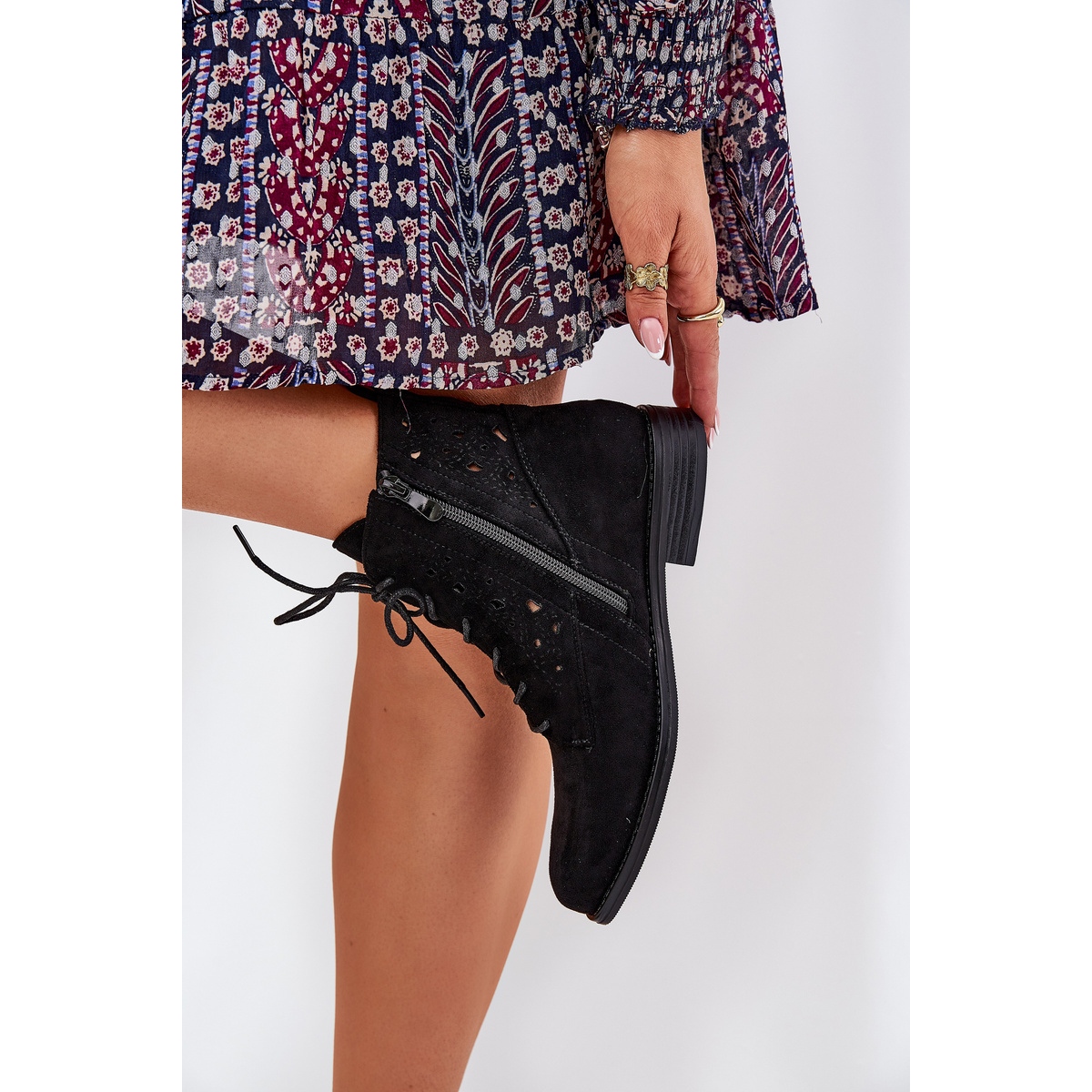 Les bottes sont fixées avec une fermeture à glissière et lacé, ce qui garantit non seulement une mise en place facile, mais aussi un ajustement parfait au pied. Grâce au talon plat de 3 cm de haut, ces chaussures seront le choix parfait pour les longues promenades et les défis quotidiens. La hauteur de la tige de 13,5 cm et une largeur de 10,5 cm font que les bottes collent bien à la cheville, et leur nez rond offre un confort.