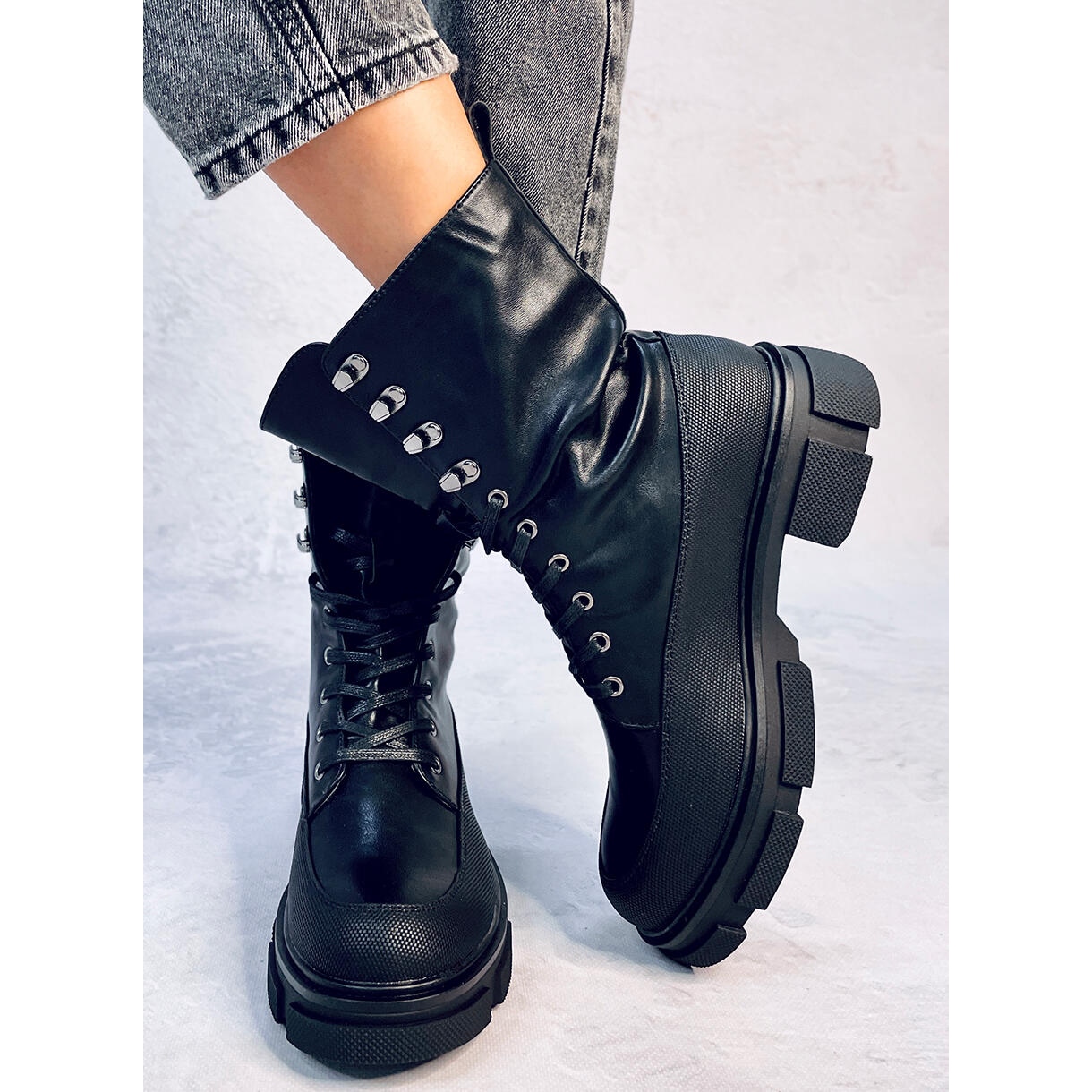 Les bottines Dart Black ont une hauteur jusqu'au bord de la cheville, et leur talon/plateforme mesure 4 cm. La fermeture des chaussures est à lacets, grâce à laquelle elles peuvent être parfaitement ajustées à la largeur du pied. La semelle intérieure des chaussures est en tissu et le matériau extérieur est en cuir écologique.