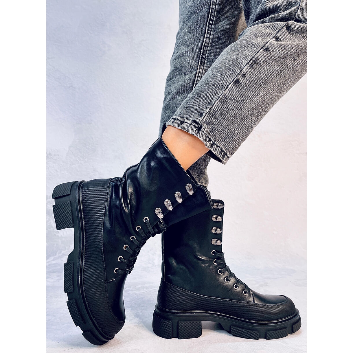 Il s'agit de bottes à lacets de style militaire pour femmes appelées Dart Black de la marque Inna Marka. Les chaussures sont pleines d'élégance et de charme classique, grâce à leur couleur noire universelle. Elles appartiennent à la catégorie "Chaussures Femme - Boots" de la collection KeeShoes.