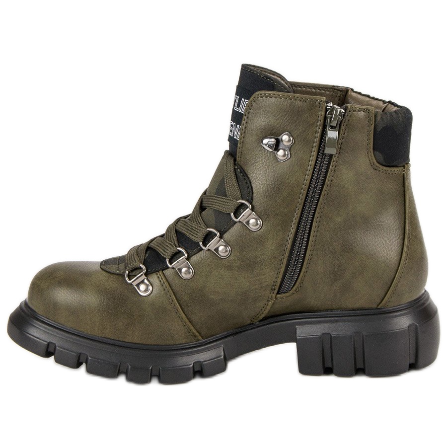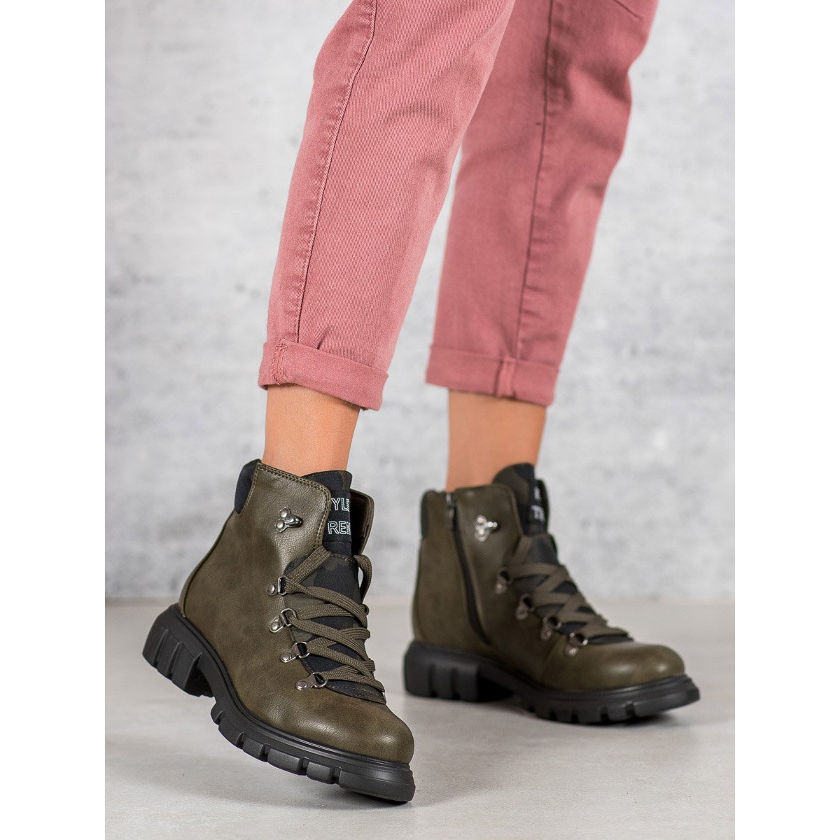Les bottes sont équipées d'un talon renforcé intégré, ce qui augmente encore le confort de port. Un bout rond et une fermeture à lacets avec fermeture éclair sont des éléments qui allient fonctionnalité et design tendance. Ils se distinguent par une couleur verte minimaliste qui complétera parfaitement n'importe quel style.