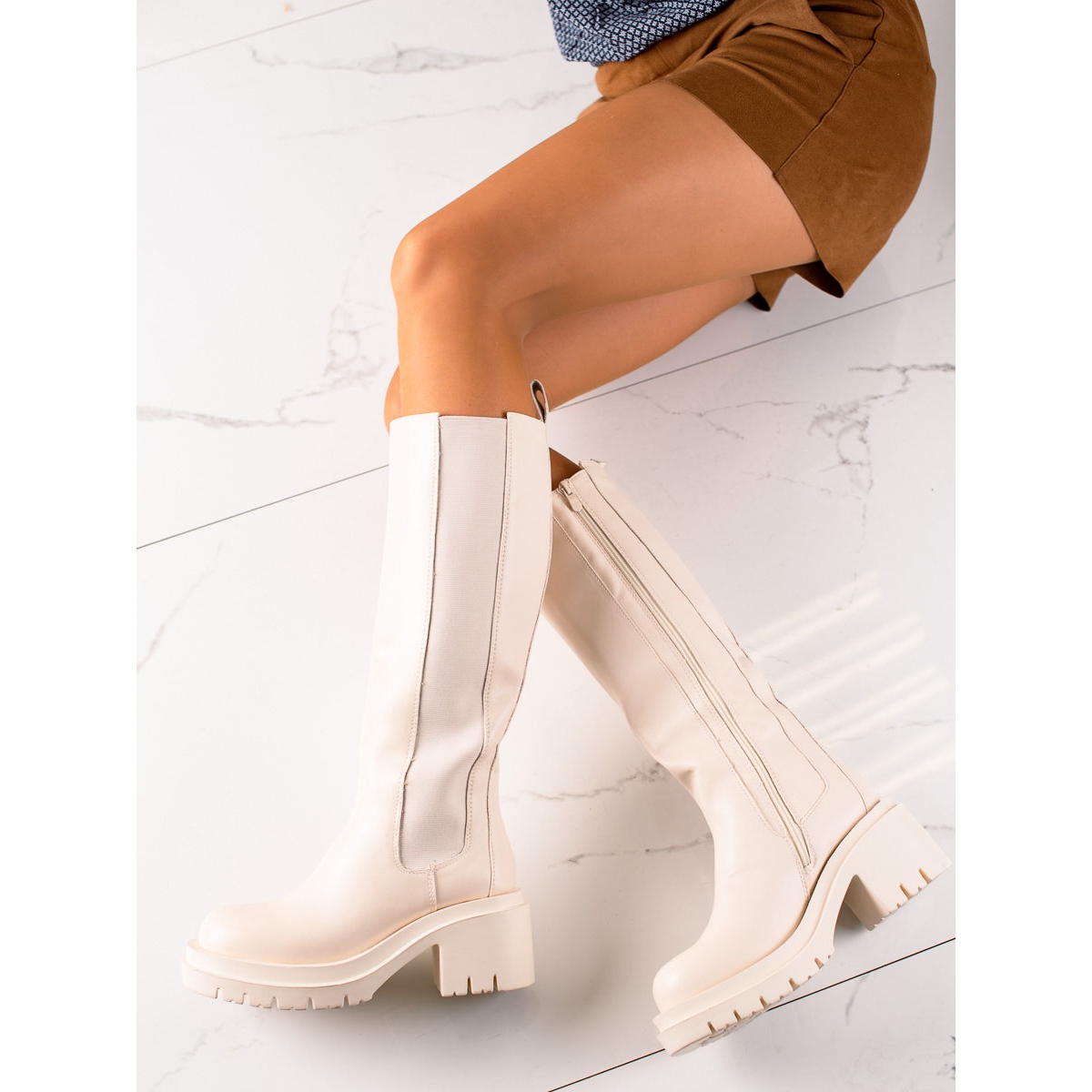 Les bottes ont un talon intégré et renforcé, qui assure stabilité et confort de port. La hauteur du talon de 7 cm et la plateforme de 3 cm de haut vous permettent de vous sentir en confiance et à l'aise, quelle que soit la durée de la journée. La largeur supérieure de 32 cm et la hauteur jusqu'à mi-mollet (36 cm) garantissent un ajustement parfait et une liberté de mouvement.