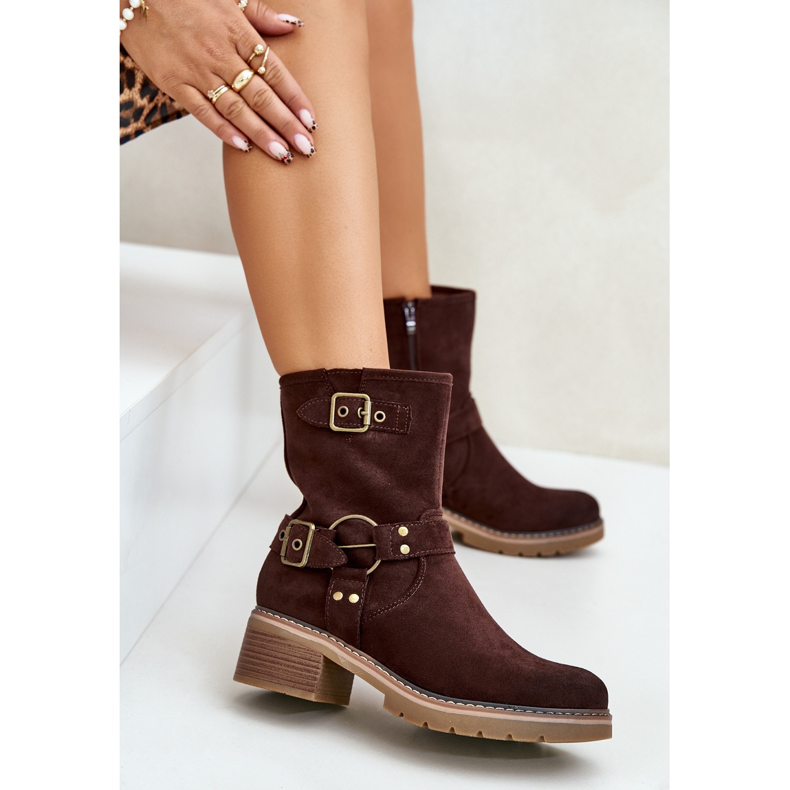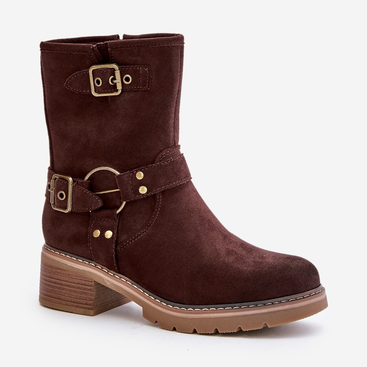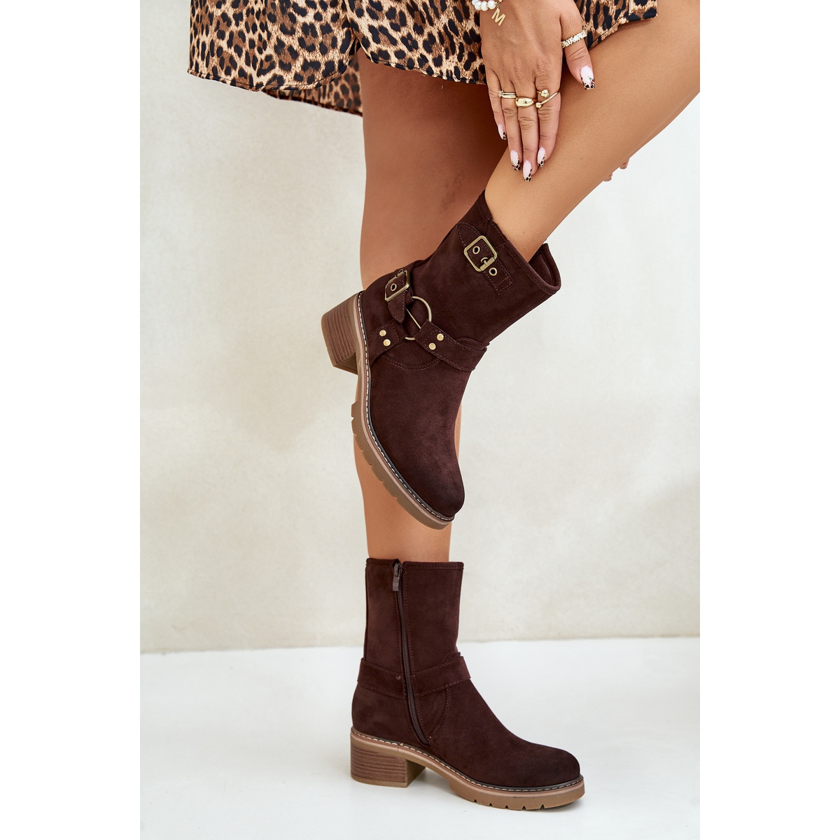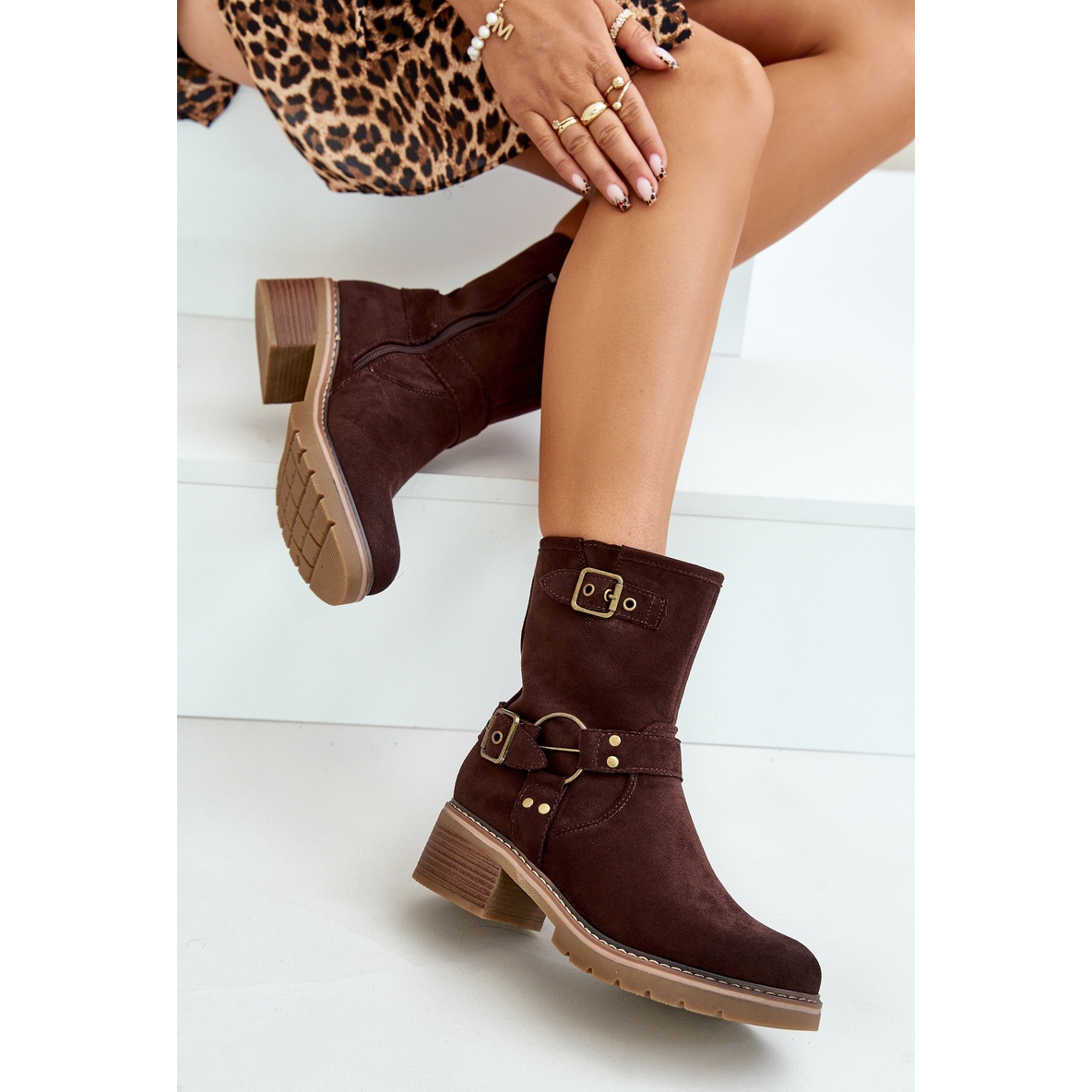 Détails: Bottes à talons bas avec boucles pour femmes, marron Zudra brun