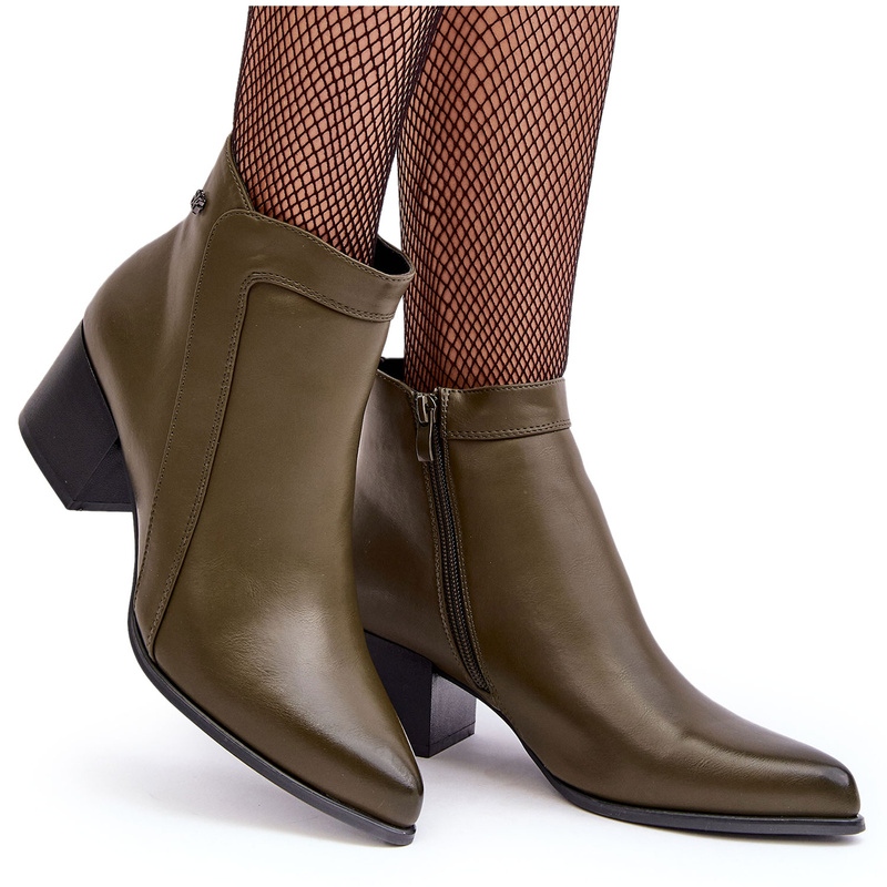 Les bottines à talons bas en cuir Sergio Leone Olive Cidi sont des chaussures élégantes pour femmes de couleur olive avec des éléments noirs supplémentaires. Les bottines israéliennes sont fabriquées en cuir écologique avec une grande importance accordée aux détails tels que les coutures et les petites décorations. Les bottes reposent sur un petit talon bloc de 6 cm.