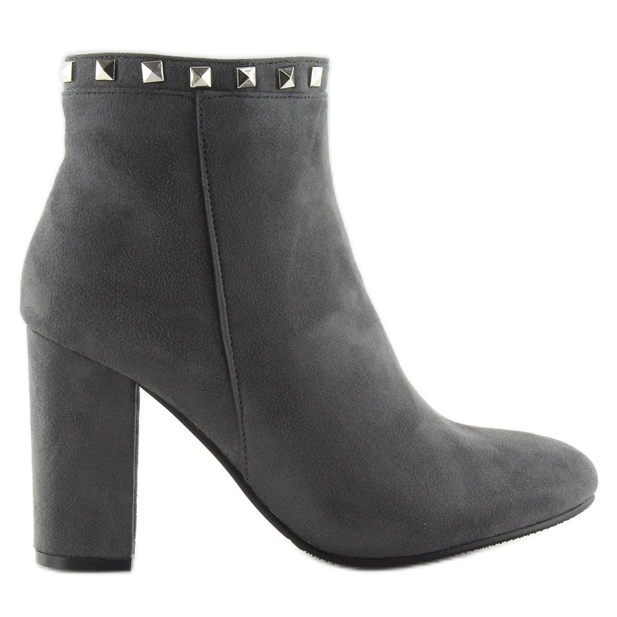 Découvrez des bottines à talons hauts uniques avec des clous dans une élégante nuance de gris qui seront le complément parfait à votre garde-robe ! Ces bottines classiques pour femmes allient style et confort, et le talon bloc stable de 9 cm vous permettra de profiter du confort même pendant une longue journée.