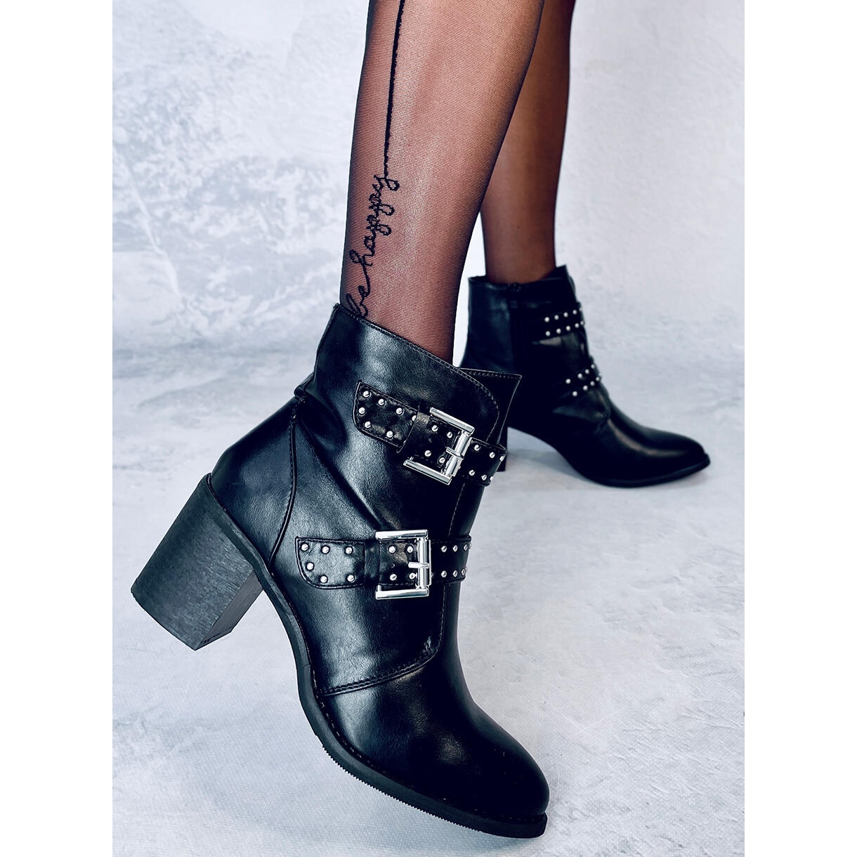 Ces bottines pour femme sont noires et arborent des clous argentés pour un look rocker. Les chaussures ont un talon large de 6,5 cm de haut, ce qui leur confère de l'élégance. Les côtés des chaussures sont dotés de brides avec boucles et d'une fermeture éclair, ce qui ajoute de la fonctionnalité.