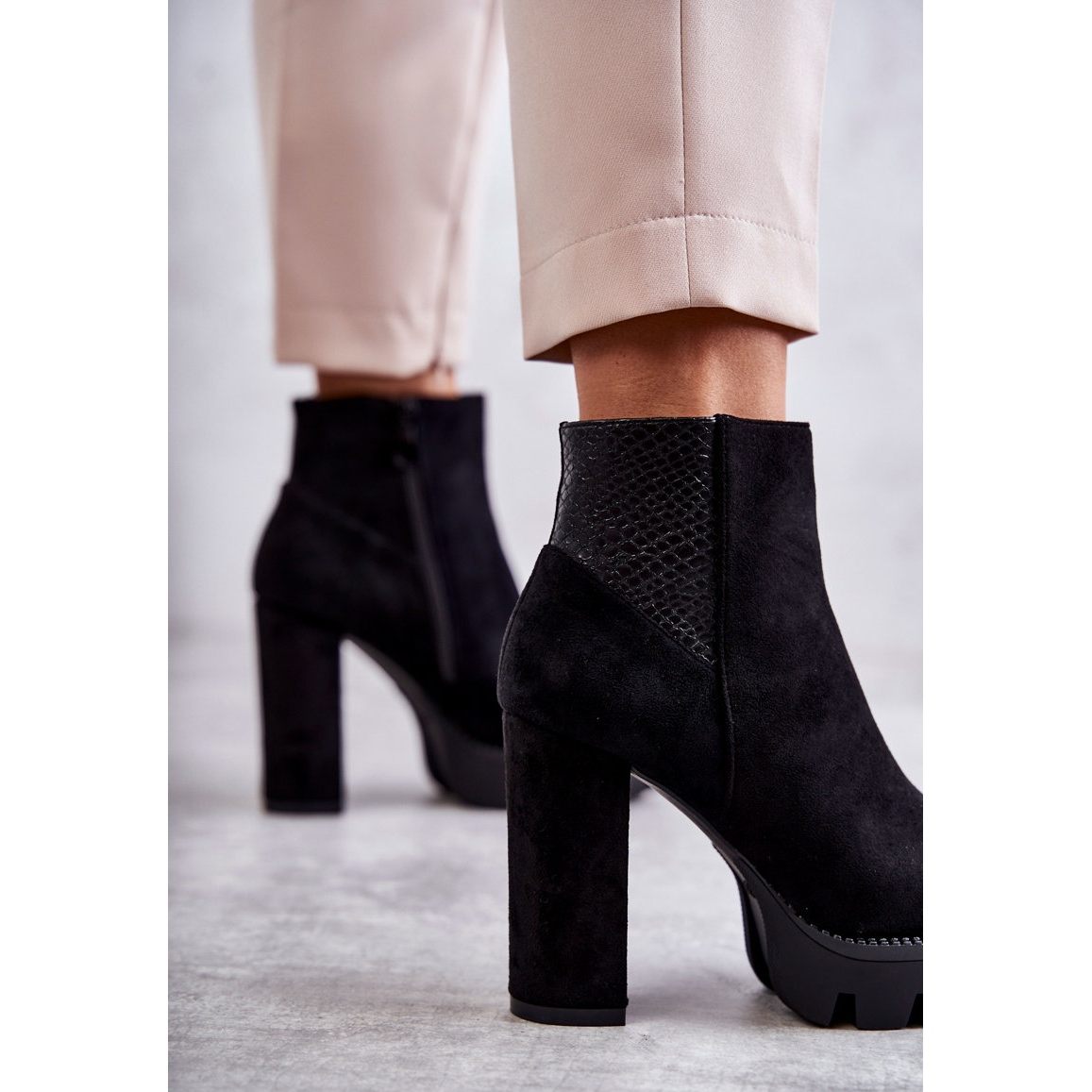 Les bottes sont montées sur un talon bloc stable de 11 cm de haut, qui ajoute de l'élégance à n'importe quel style. La plateforme massive avec rainures garantit non seulement un look tendance, mais également une meilleure adhérence et un meilleur confort de port. Grâce à la fermeture éclair située sur le côté de la tige, l'enfilage et le retrait des chaussures sont extrêmement faciles et rapides, ce qui sera apprécié par toutes les femmes occupées.
