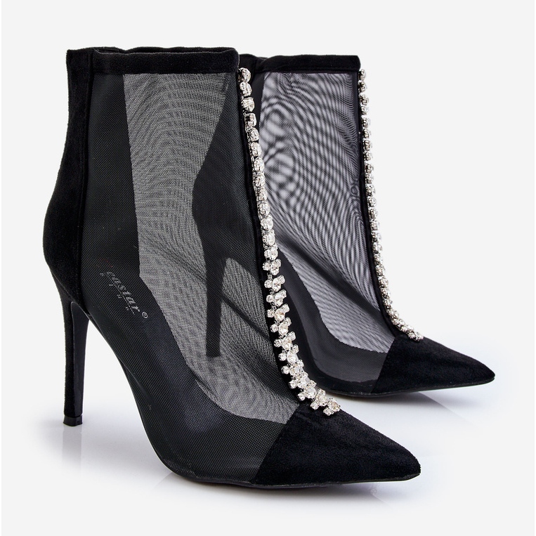 Le modèle est monté sur un talon haut en forme de stylet, qui allonge optiquement les jambes et souligne leur finesse. Les bouts pointus ajoutent élégance et féminité à l'ensemble du look. La tige, arrivant au-dessus de la cheville, est décorée de strass étincelants sur le devant qui imitent les strass, ajoutant un éclat unique aux bottes.