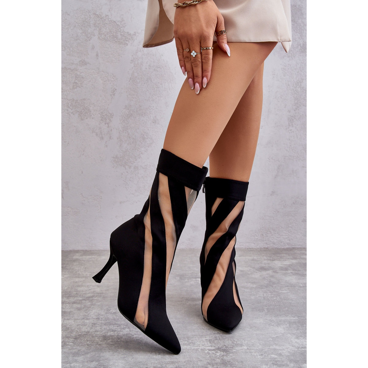 La tige de ces bottes uniques séduit par sa texture - la combinaison d'un matériau lisse et d'un plastique de haute qualité reflète les dernières tendances et assure durabilité et confort de port. Le bout pointu et le talon aiguille de haute qualité de 8,5 cm de haut affinent parfaitement la silhouette, donnant l'illusion de jambes plus longues.