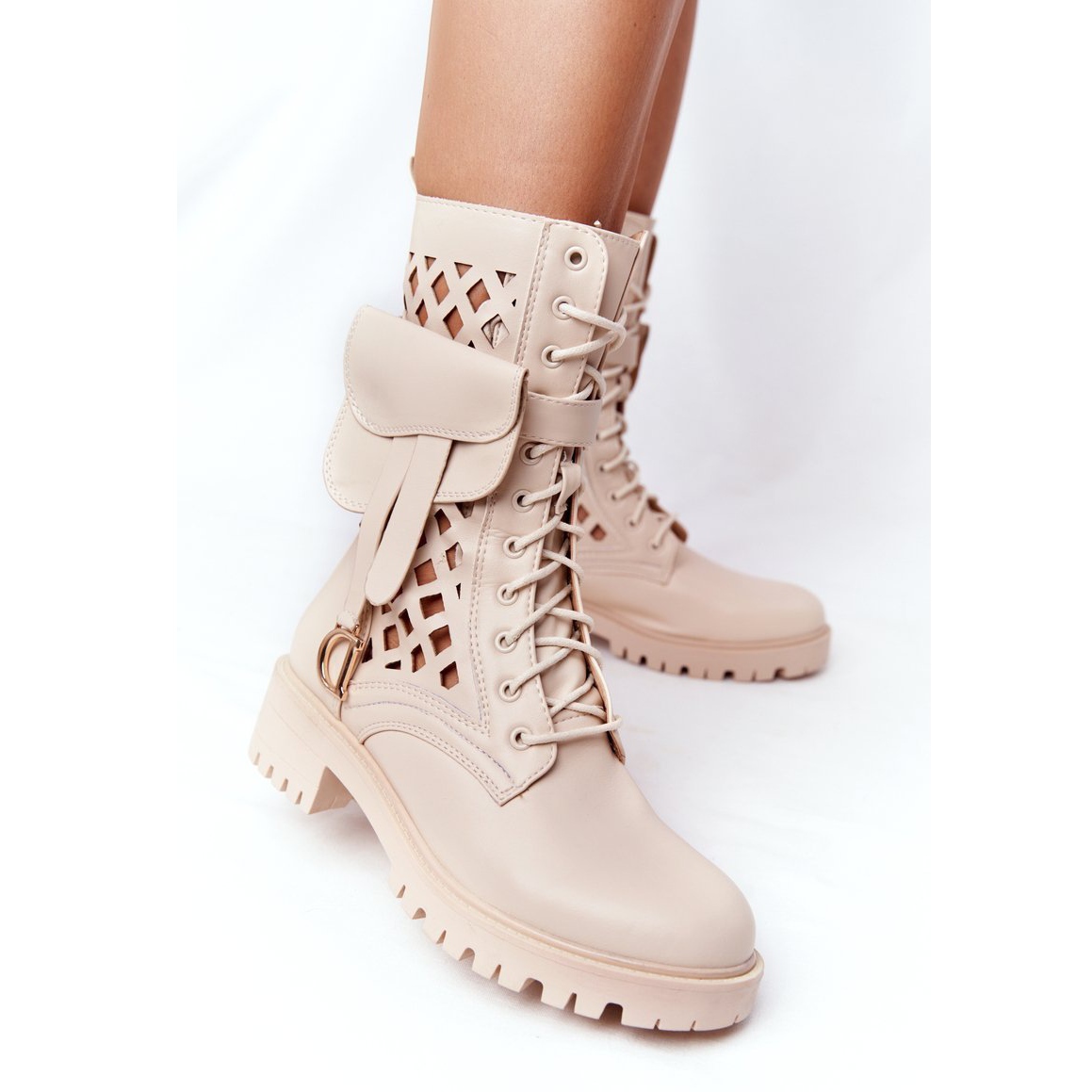 Bottines ajourées PS1 - Beige Rock Star est un choix élégant pour les femmes qui apprécient une combinaison unique de confort, de fonctionnalité et de design à la mode. Ces bottines beiges ajourées, ornées d'un sac banane amovible, sont non seulement pratiques, mais aussi expressives - parfaites pour les courageux amateurs de solutions originales.