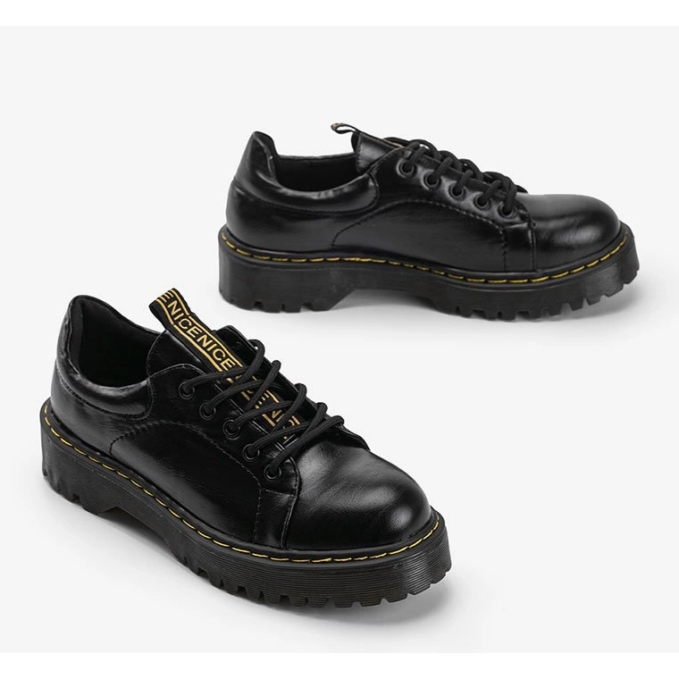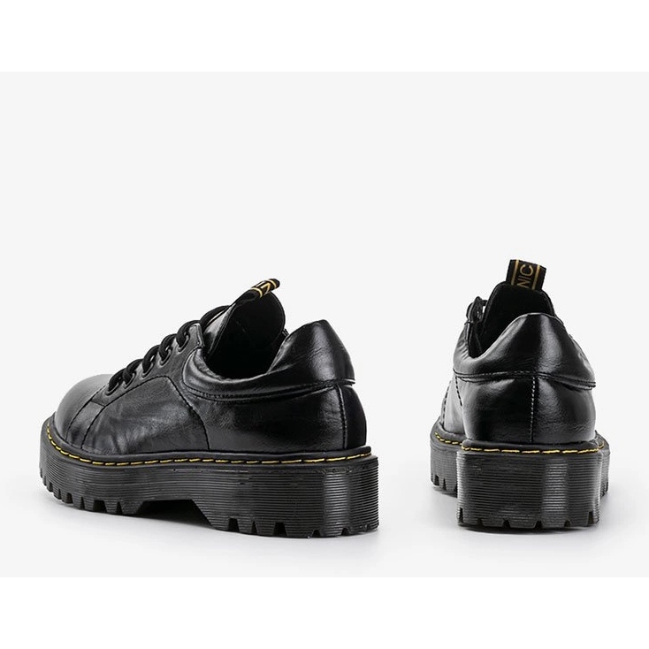 Il s'agit de chaussures pour femmes d'Alexus, connues sous le nom de semi-bottes. Ils sont de style punk rock, noirs, sur une plateforme épaisse, ce qui leur donne du caractère. La bordure jaune autour de la plate-forme constitue un accent particulier. Les chaussures sont fabriquées en cuir écologique de haute qualité, ce qui les rend respectueuses de l'environnement.