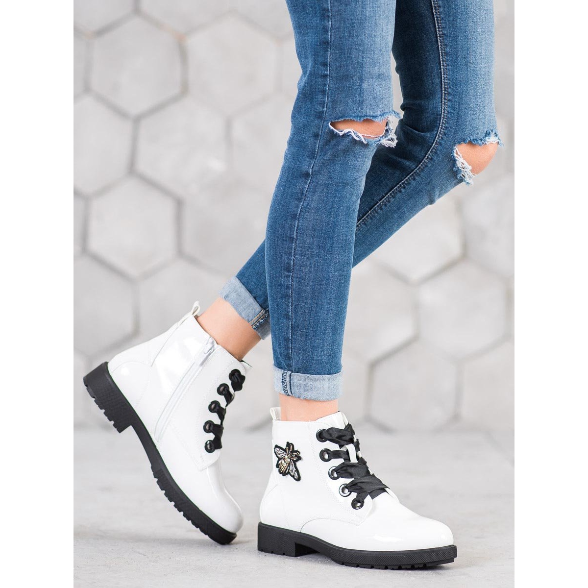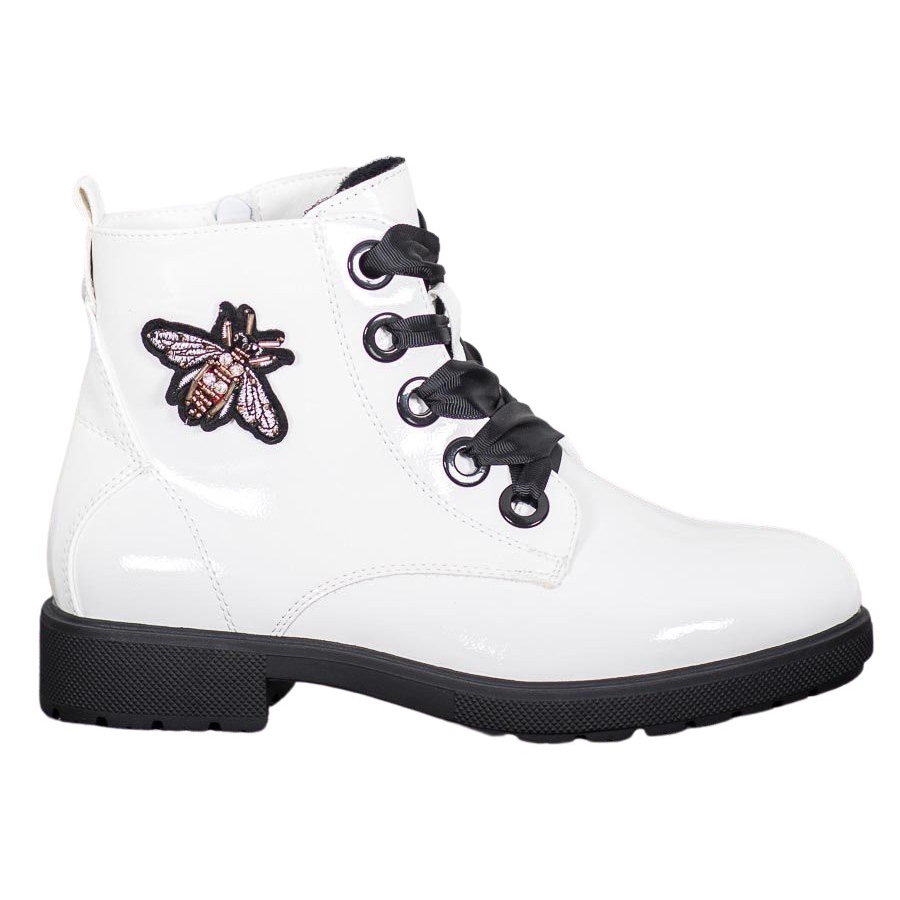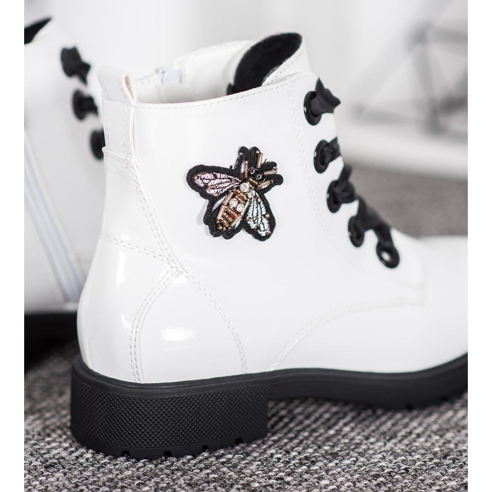 Des lacets noirs placés à l'arrière de la tige créent un contraste saisissant avec la finition légère, et une semelle synthétique lourde d'une hauteur de 3 cm garantit stabilité et confort. Un élément distinctif supplémentaire de ces bottes est une application unique en forme d'insecte placée sur le côté au-dessus de la cheville, ce qui leur donne un look unique.