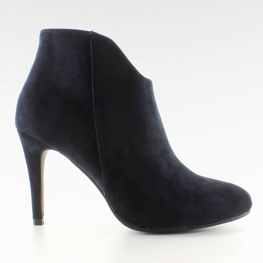 Bottines élégantes pour femmes AT-0592-L dans une teinte bleu marine profond, qui allient une coupe féminine au confort hivernal. Fabriqués en cuir suédé écologique charnu, doublés d'une fourrure délicate à l'intérieur, ils sont parfaits pour les journées plus froides. Un talon haut fin de 9,5 cm et une coupe élégante à l'avant de la tige allongent et affinent optiquement la jambe, et le bout rond ajoute de l'élégance. Chaussures à enfiler - rapides et confortables à utiliser.