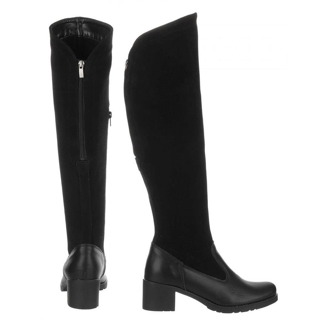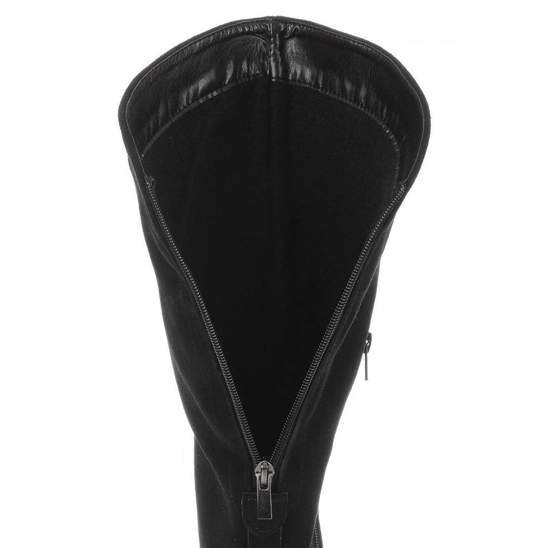Le produit décrit est des bottes pour femme d'Olivier, modèle Agnes Z. Ce sont des chaussures d'hiver isolées avec une tige haute arrivant jusqu'aux genoux. La hauteur totale de la botte est d'environ 52 cm. Les bottes sont fabriquées en cuir naturel de haute qualité, résistant à l'humidité. Ce modèle se caractérise par un design noir et classique sans aucun motif dominant.