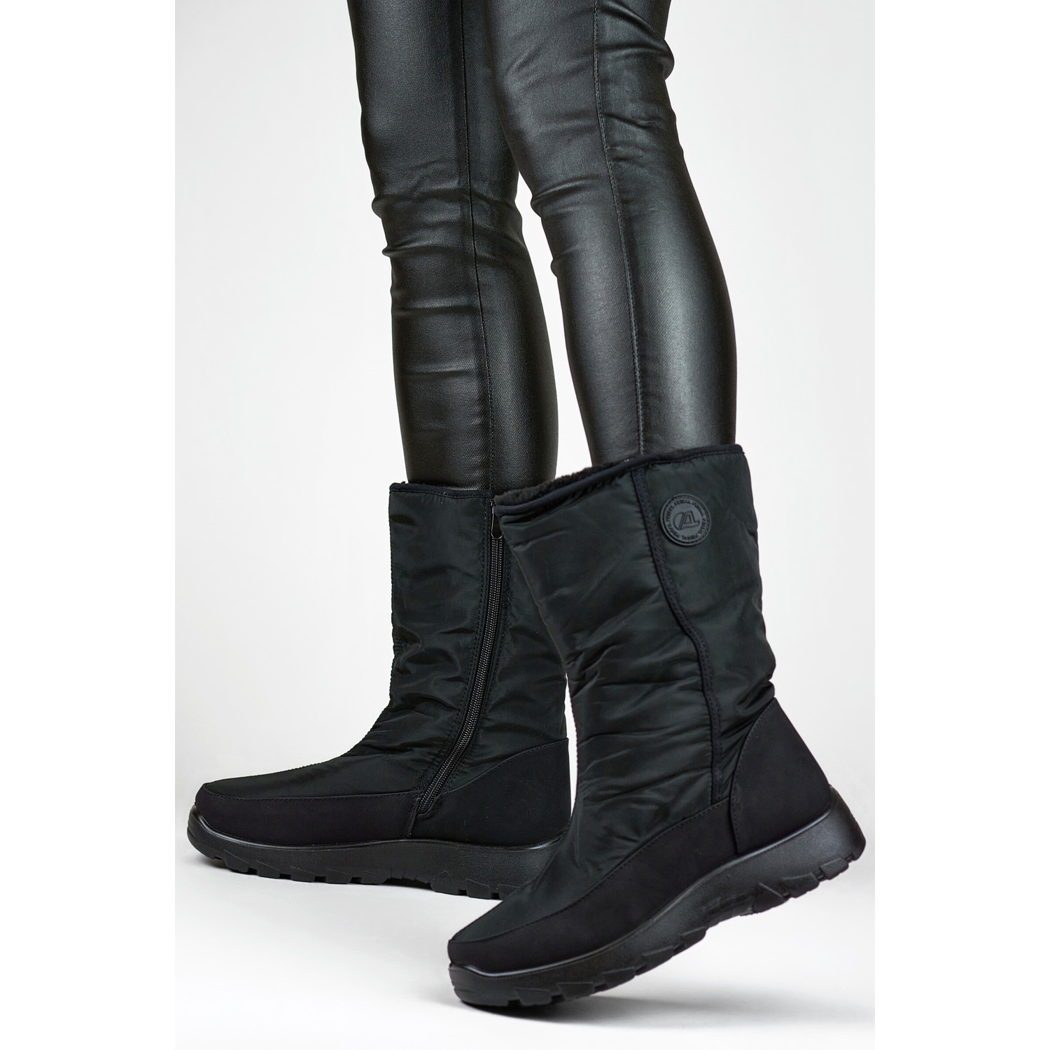 Des bottes de neige classiques et noires conçues pour le confort et la protection contre le froid. Fabriqué en matériaux synthétiques durables, isolés de fourrure écologique à l'intérieur, parfaits pour les jours froids - à la ville et pour les promenades.