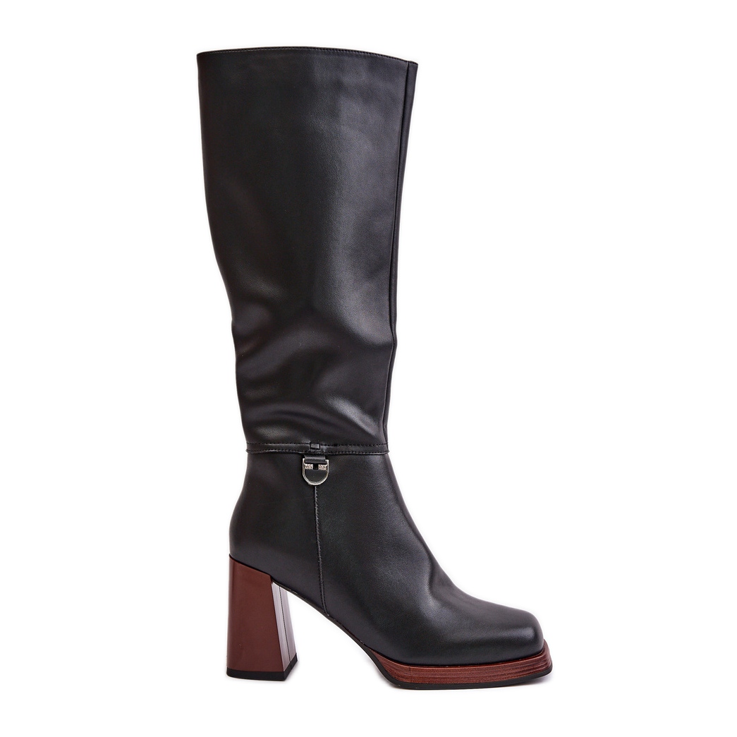 Ces bottes atteignant les genoux sont intégrées sur un talon stable sous la forme d'un poteau, qui mesure 9 cm de haut, ce qui affecte le confort de porter et ajoute la classe et le style. Le nez carré classique leur donne un personnage moderne, et la fermeture éclair le rend plus facile à mettre et à décoller.