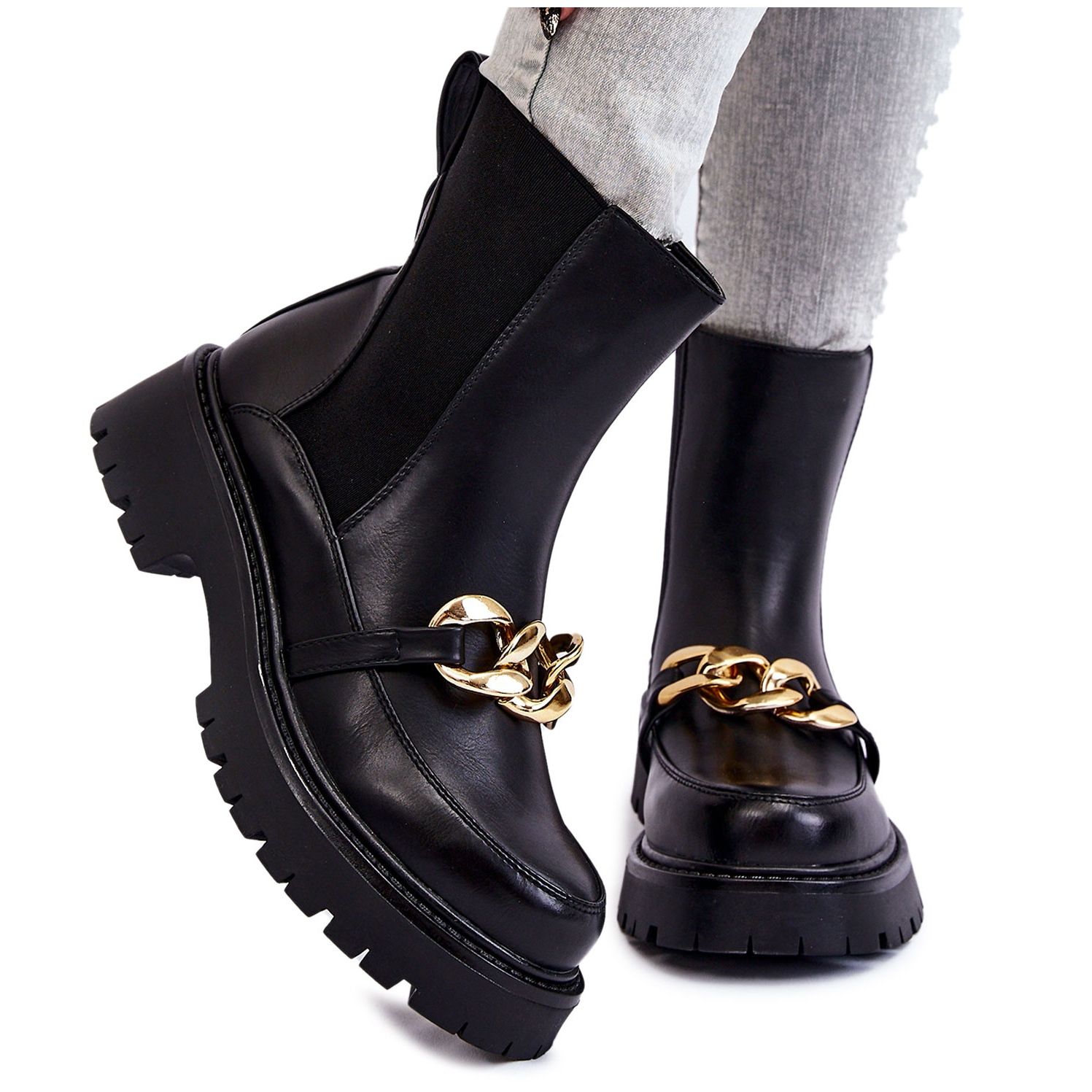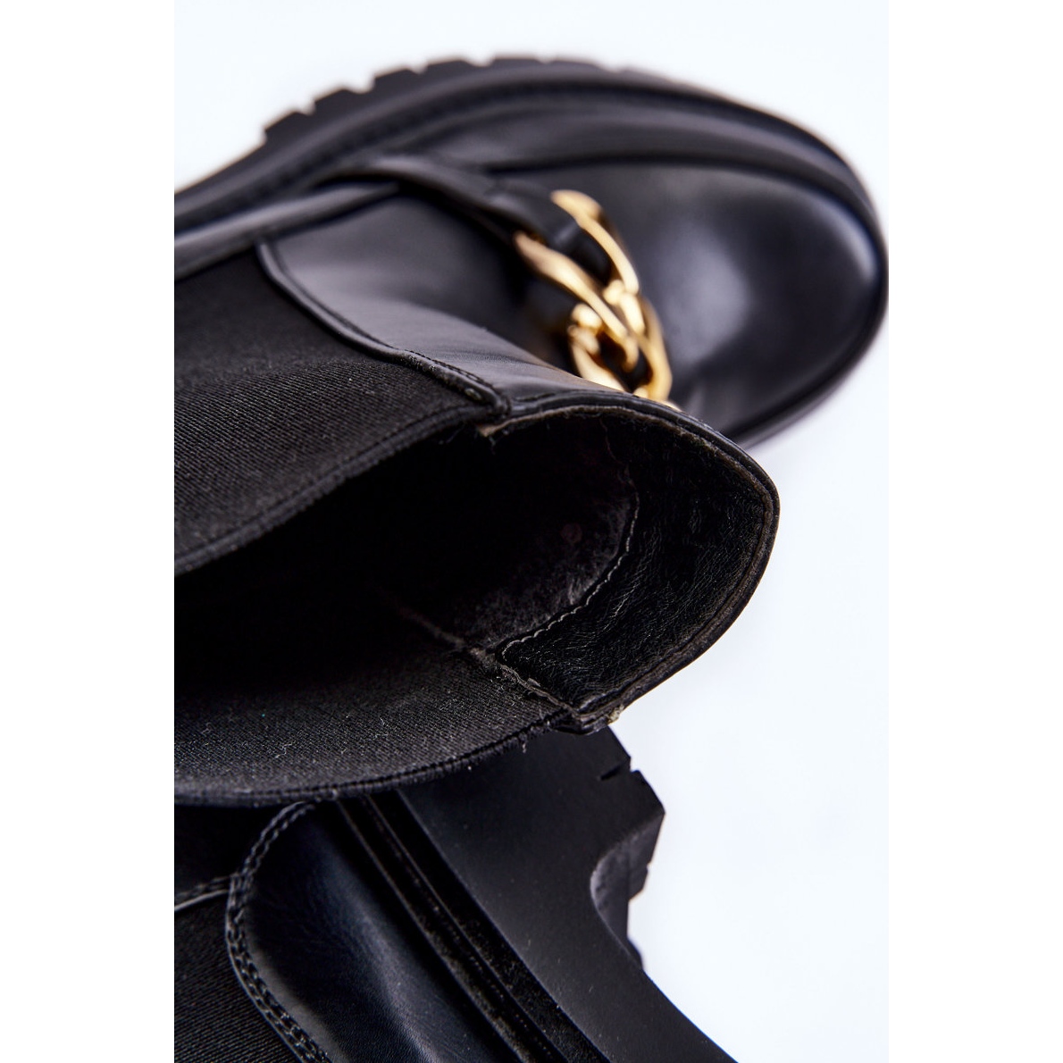 L'un des éléments les plus importants de ce modèle est l'impressionnante chaîne sur le devant, qui ajoute un caractère original à l'ensemble. Les bottes ont un talon plat de 5 cm de haut et des semelles rainurées qui assurent stabilité et sécurité pendant la marche. Leur couleur noire minimaliste les rend parfaitement adaptés à différents styles, aussi bien pour un usage quotidien que pour des occasions plus formelles.