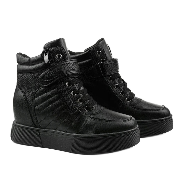 Les bottes sont équipées d'une cale de 8 cm de haut, qui non seulement allonge optiquement les jambes, mais garantit également un confort de port grâce à une base plus stable. Grâce au laçage et à la fermeture éclair, les chaussures s'adaptent parfaitement au pied, ce qui augmente leur fonctionnalité.