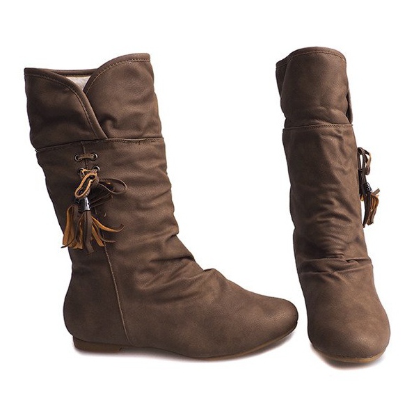 La tige classique, d'environ 28 cm de haut, épouse joliment la jambe, soulignant sa forme. Les bottes sont fabriquées en cuir suédé écologique de haute qualité, ce qui ajoute de l'élégance et les rend agréables au toucher. Les foulards se caractérisent également par un détail original sous forme de franges, qui confèrent aux chaussures un caractère léger et tendance.
