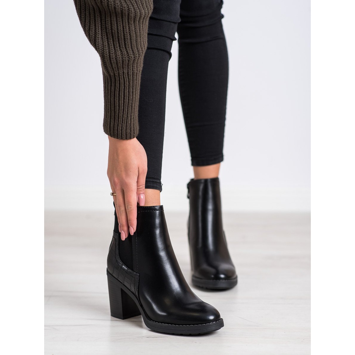 Les bottes sont fabriquées en cuir écologique de haute qualité, ce qui contribue non seulement à leur aspect attrayant, mais aussi à leur durabilité. La tige haute, atteignant au-dessus de la cheville (10-11 cm), assure en outre une stabilité et un confort de port adéquats, et le nez rond permet d'y passer de longues heures sans ressentir aucune gêne.
