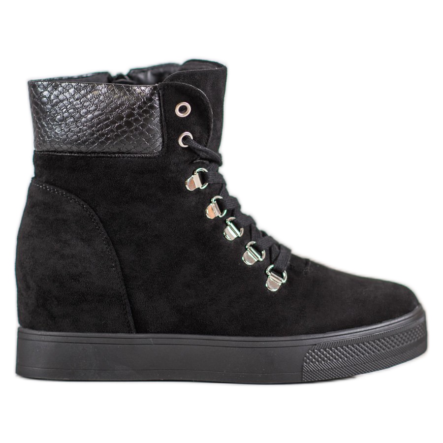 Des bottes avec une cale cachée de 4 cm de haut et une plateforme de 2,5 cm garantissent un confort de port, même lors de longues promenades. La tige haute, atteignant au-dessus de la cheville, ajoute non seulement du caractère, mais fait également de ces chaussures un excellent choix pour un usage quotidien. Un laçage sur le devant et une fermeture éclair pratique à l'intérieur facilitent l'enfilage et l'ajustement au pied, assurant ainsi la stabilité.