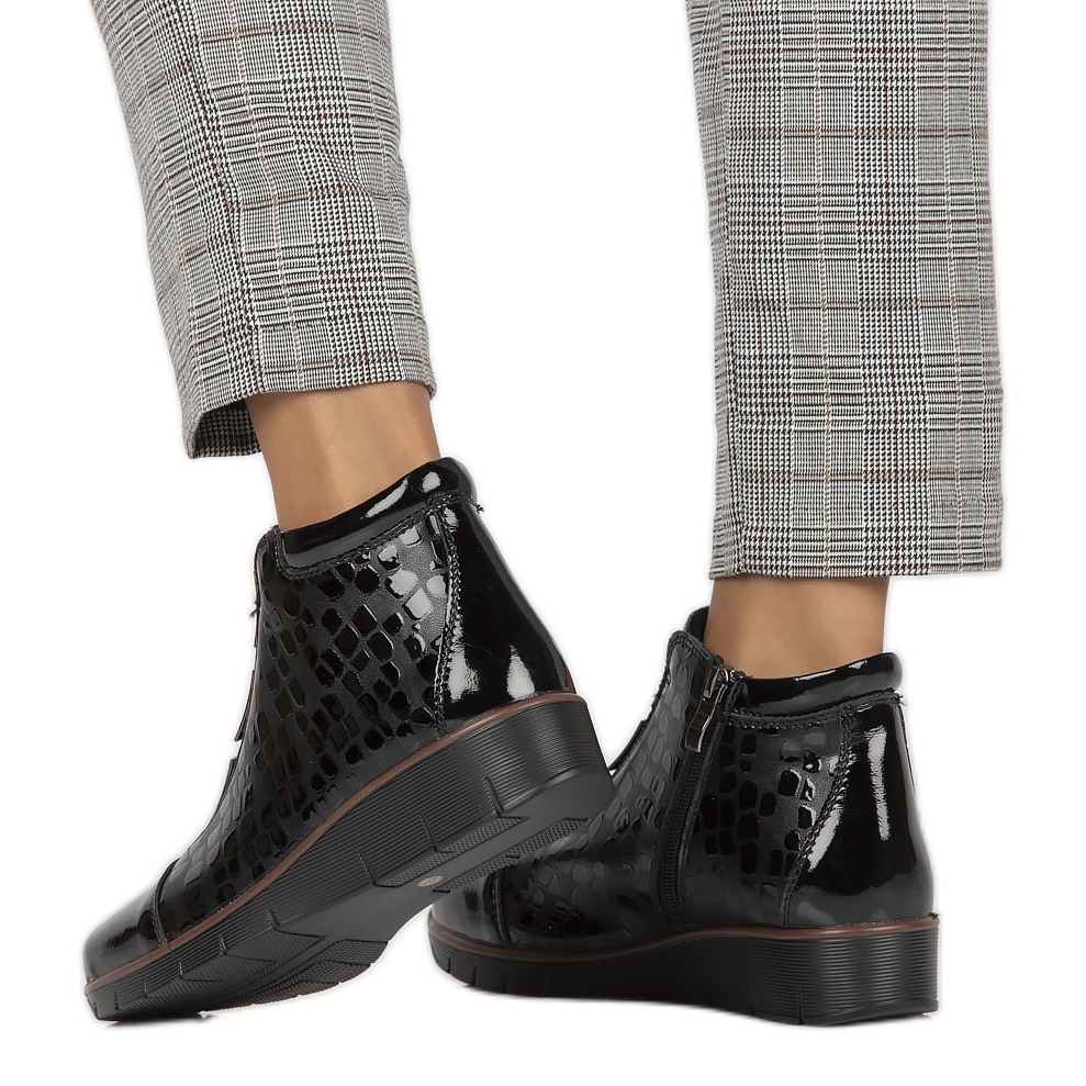 Les bottes Filippo PAW277A se distinguent également par une jolie cale de 3,5 cm de haut, qui ajoute de la légèreté et allonge optiquement les jambes. Le nez rond et la finition laquée leur confèrent un caractère original, et le motif animalier souligne le design moderne.